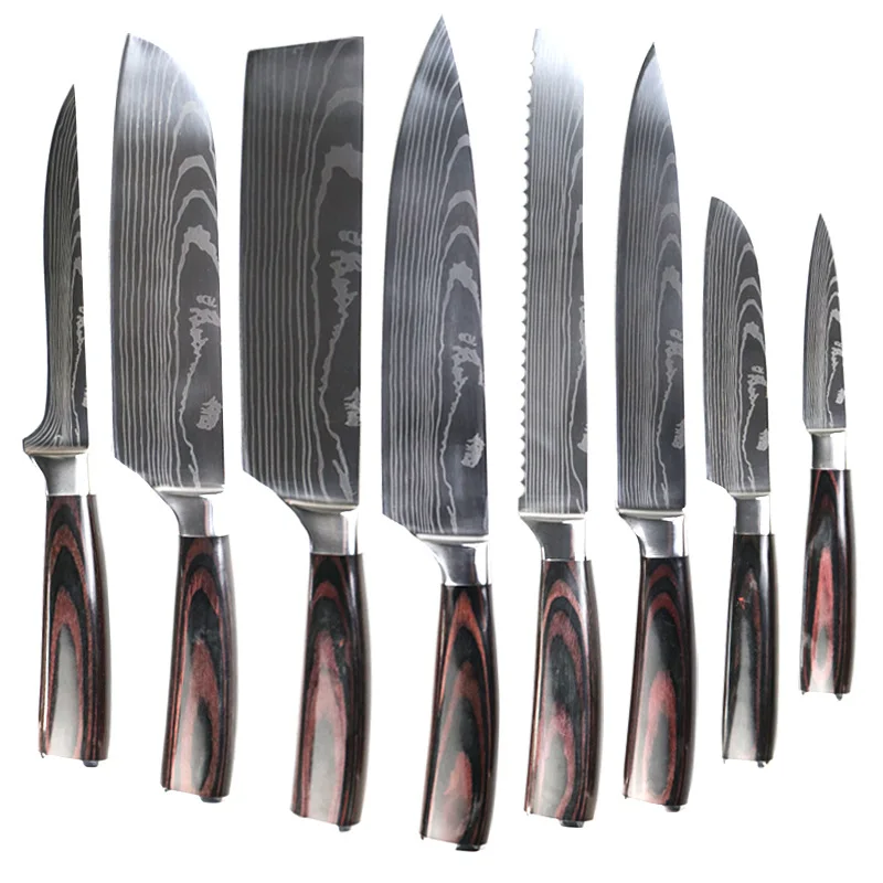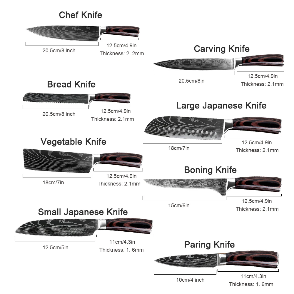 Этот комплект ножей 8 включает нож шеф-повара, нож для резьбы, нож для хлеба, большой японский нож, нож для овощей, нож для скрепления, маленький японский нож, И нож для очистки овощей, чтобы удовлетворить ваши различные требования к резке. Будь то резка мяса, резка овощей, склеивание, пилинг или резка хлеба, они отлично работают.