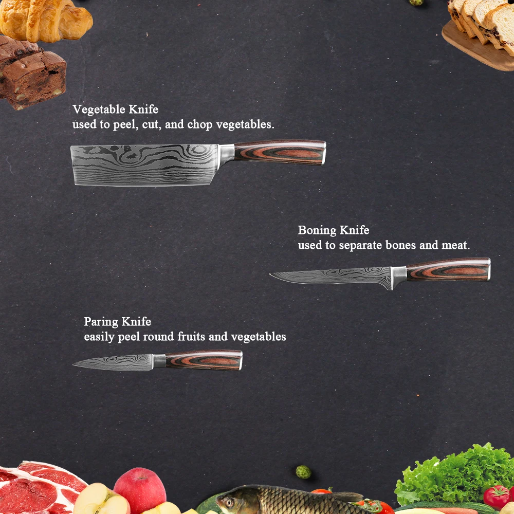 • Практичные ножи: нож шеф-повара-это комплексный нож, который можно использовать для резки мяса, рыбы и овощей; Нож-Кливер используется для резки, резки, штамповки и резьбы; японский нож используется для резки мяса, овощей и фруктов; Скрепляющий нож используется для разделения костей и мяса, а нож для очистки овощей может легко очищать круглые фрукты и овощи.