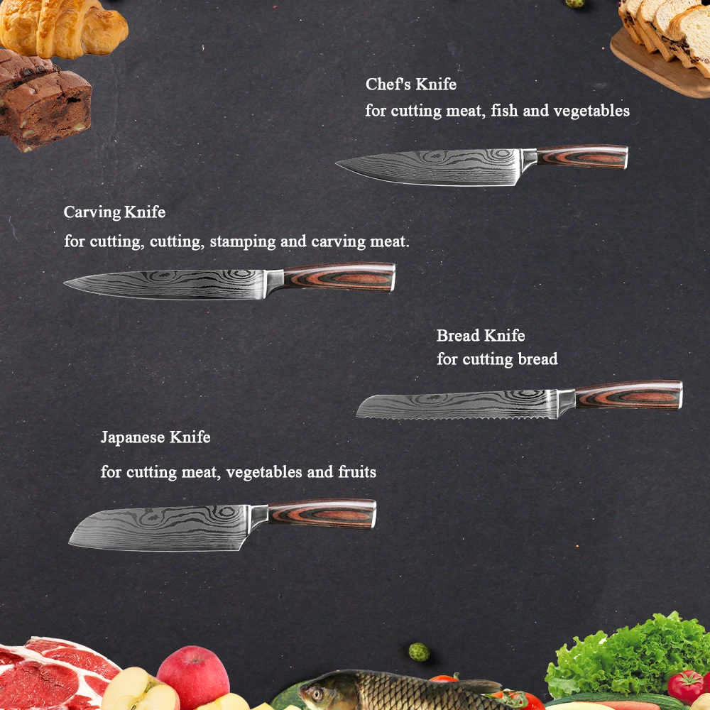 • Набор многофункциональных ножей: 8 комплект ножей включает нож шеф-повара, нож для резьбы, нож для хлеба, большой японский нож, нож для овощей, нож для скрепления, маленький японский нож, И нож для очистки овощей. Будь то резка мяса, резка овощей, склеивание, пилинг или резка хлеба, они могут удовлетворить ваши требования.