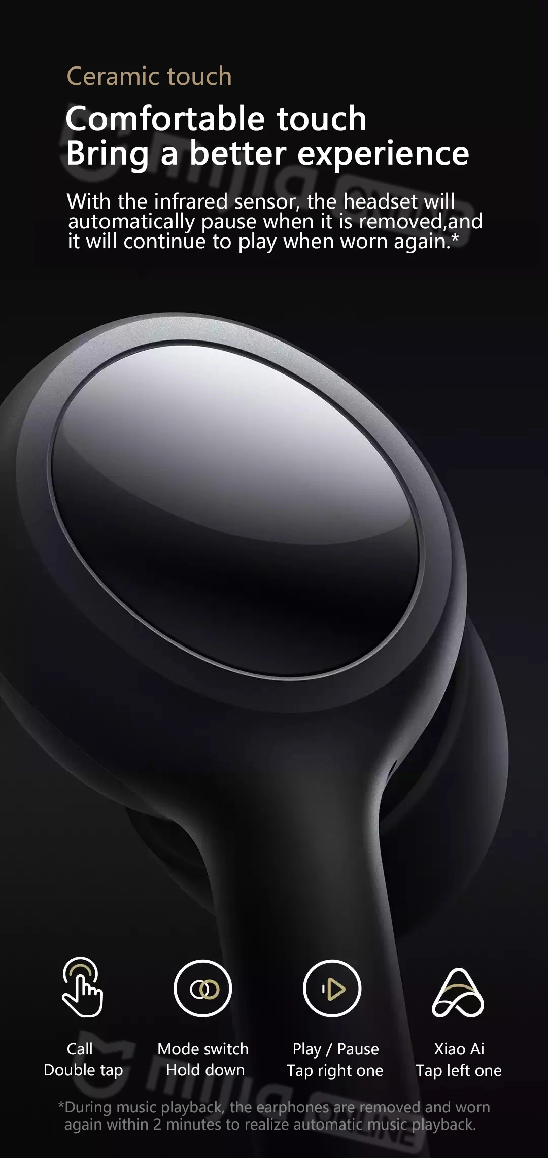 С помощью инфракрасного датчика гарнитура автоматически приостанавливается, когда она будет снята, и она продолжит воспроизводить при повторном ношении. *[Mijia Online]
