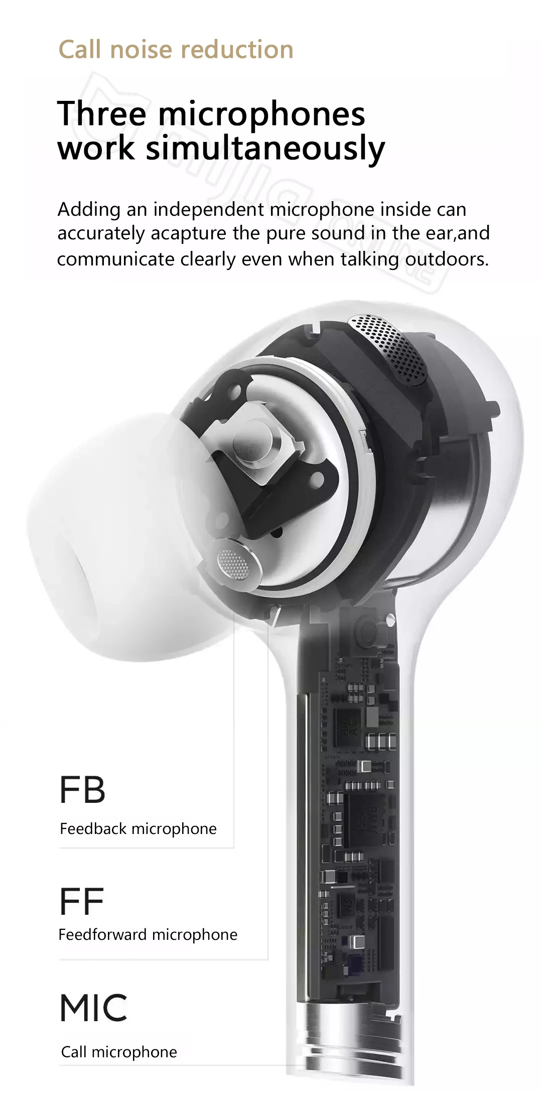 Добавление в гарнитуру независимого микрофона позволяет точно улавливать чистый звук в ухе и четко общаться даже при разговоре на улице.