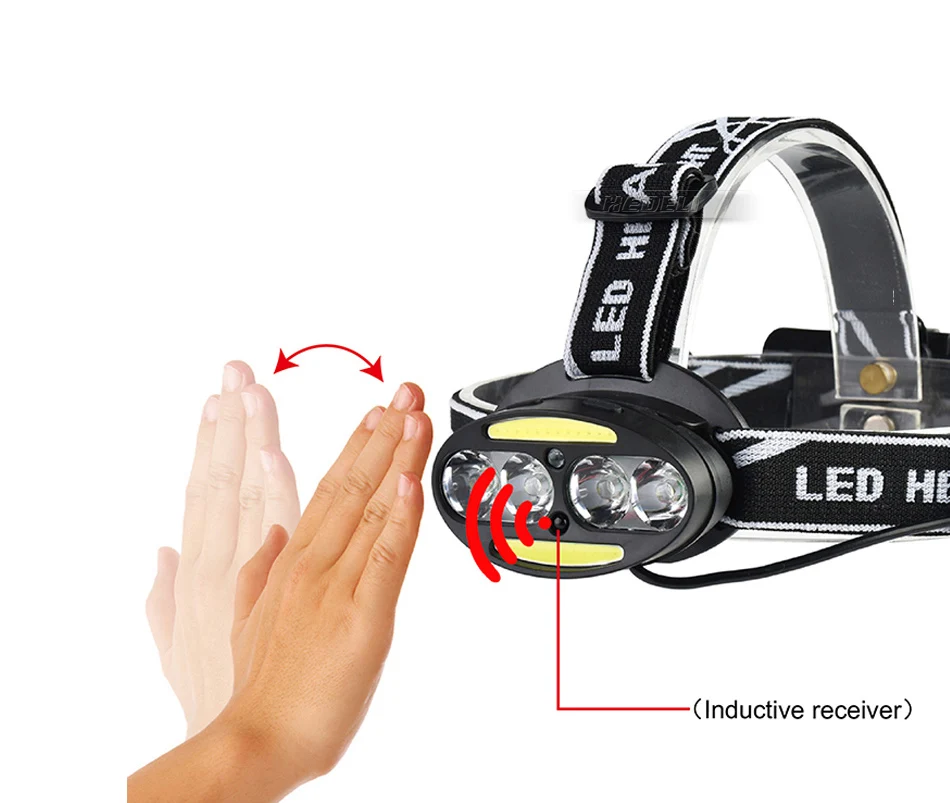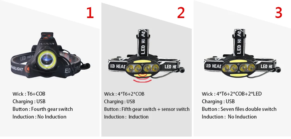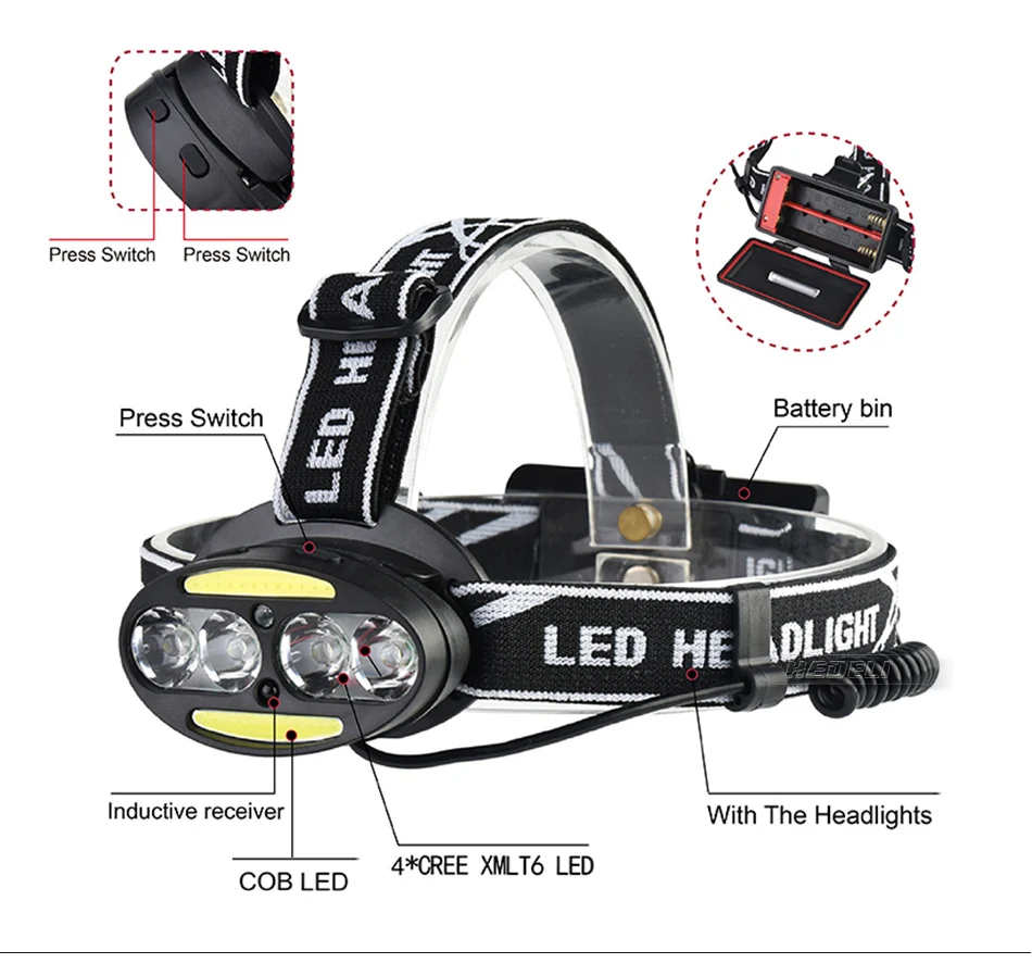 2.Режимы:Переключатель передач 5 режимов 4 * T6Высокая-4 * T6 слабый светильник-4 * T6 стробоскоп-2 * COBВысокая-2 * COB слабый светильник; Переключатель датчика: 2 режима 4 * T6 датчик-переключатель-2 * COB датчик