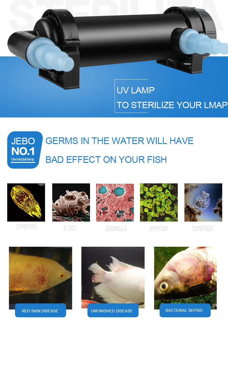 Напряжение: 220-240 В Тип: рыба Мощность: 5 Вт Напряжение: 220 ~ 240 В Мощность: 5 Вт (35 ~ 60 галлонов) 7 Вт (40 ~ 75 галлонов) 9 Вт (45 ~ 150 галлонов) 11 Вт (60 ~ 180 галлонов) 13 Вт (75 ~ 200 галлонов) 18 Вт (90 ~ 220 галлонов) 24 Вт (120 ~ 300 галлонов) 36 Вт (150 ~ 350 галлонов) Кабель: 190 см Время работы в день: 6 часов Содержимое упаковки: ультрафиолетовый стерилизатор JEBO 1 шт. Напряжение: 220 ~ 240 В Мощность: 5 Вт (35 ~ 60 галлонов) 7 Вт (40 ~ 75 галлонов) 9 Вт (45 ~ 150 галлонов) 11 Вт (60 ~ 180 галлонов) 13 Вт (75 ~ 200 галлонов) 18 Вт (90 ~ 220 галлонов) 24 Вт (120 ~ 300 галлонов) 36 Вт (150 ~ 350 галлонов) Кабель: 190 см Время работы в день: 6 часов Содержимое упаковки: УФ-стерилизатор 1 шт. Модель UV-H5: About-1.10kg UV-H7: About-1.14kg UV-H9: About-1.21kg UV-H11: About-1.32kg UV-H13: About-1.36kg UV-H18: About-1.02kg UV-H24: About-1.29kg UV-H36: About-1.36kg Тепло: УФ-луч наносит вред люди и домашние животные растению, пожалуйста, не облучайте металл.
