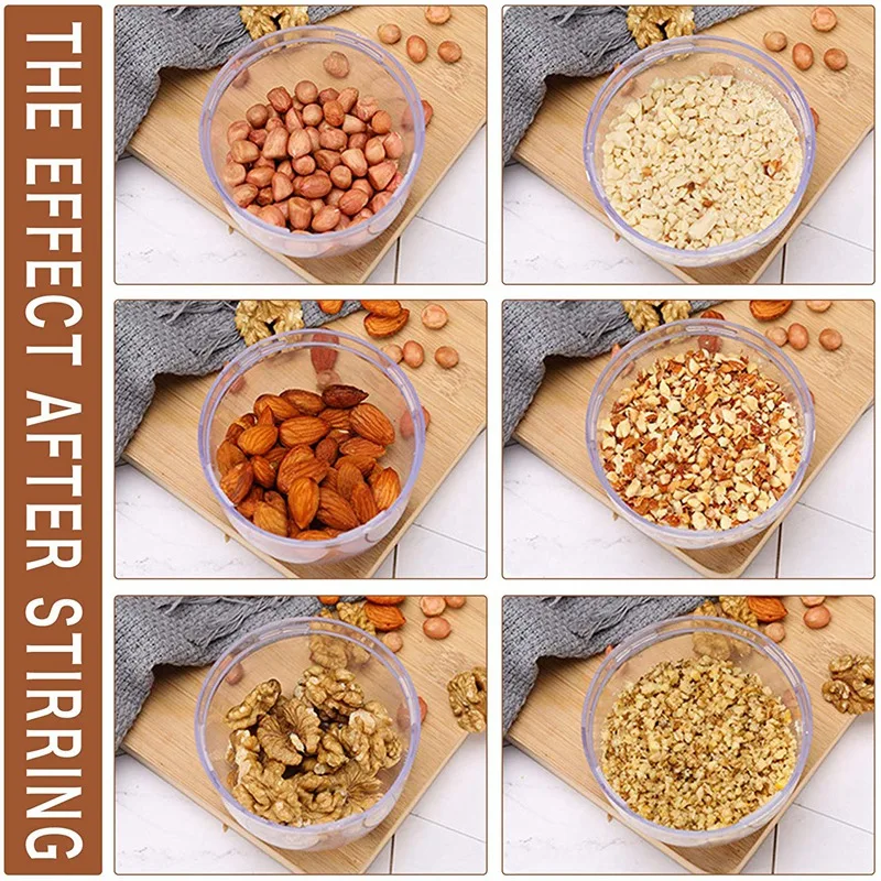 Ореховая шлифовальная машина для всех орехов: отлично подходит для измельчения миндаля, филбертов, арахиса, пекана, грецких орехов и других типов орехов; Посыпать на хлебобулочные изделия, десерты, салаты и многое другое. В то же время, это измельчитель специй, он также может нарезать имбирь и чеснок.
