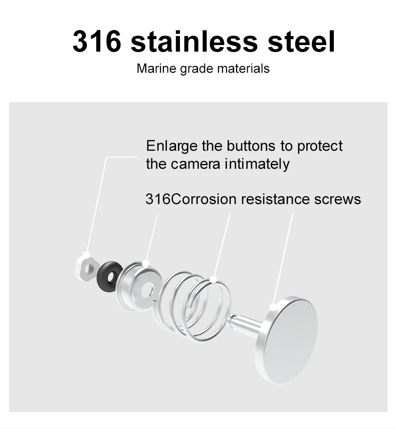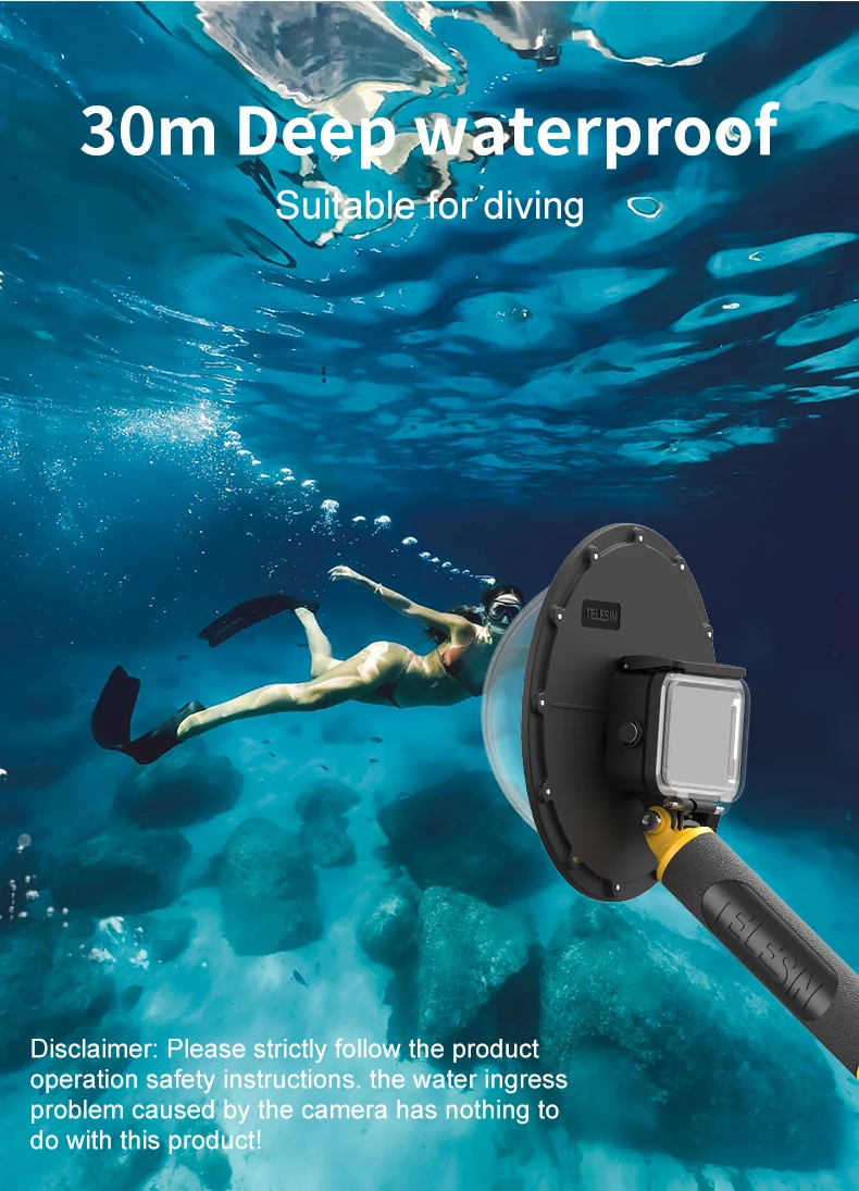 1. Перемещение водной линии от объектива позволяет одновременно снимать изображения как выше, так и под водой. 2. Простота в эксплуатации, почти бесконечная глубина поля, широкоугольный объектив. 3. Водонепроницаемый глубина до возможностью погружения на глубину до 30 м, светильник с высоким коэффициентом пропускания до 93%. 4. 8 дюймов светильник-вес плавающая рукоятка w/ 1/4 Стандартный резьбовое отверстие. 5. Супер-Удобная ручка TPE, отличное мягкое прикосновение, нескользящая и экономичная. 6. Плавающий в воде/использование в земле 7. Оснащен кнопкой спуска затвора для быстрой работы 8. Рукоятку можно отвинтить, чтобы открыть полый отсек, который можно использовать для добавления воды (для достижения нейтральной плавучести под водой) или хранения мелких предметов. 9. Регулируемый ремешок обеспечивает большую безопасность вашей экшн-камеры 10. Противотуманные вставки предотвращают запотевание корпуса камеры. Сушить естественно, многоразовые. 11.CD защита от отпечатков пальцев Дизайн: Навигация специальный материал из нержавеющей стали 316, широкая головка кнопки, Защита камеры