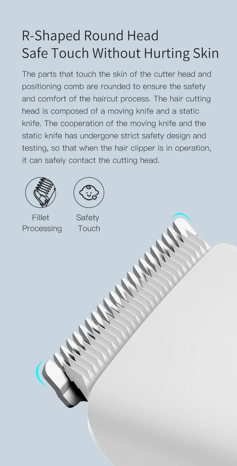 Части, которые контактируют с кожей с режущей головкой и расчески позиционирования, округлены для обеспечения безопасности и комфорта во время стрижки волос