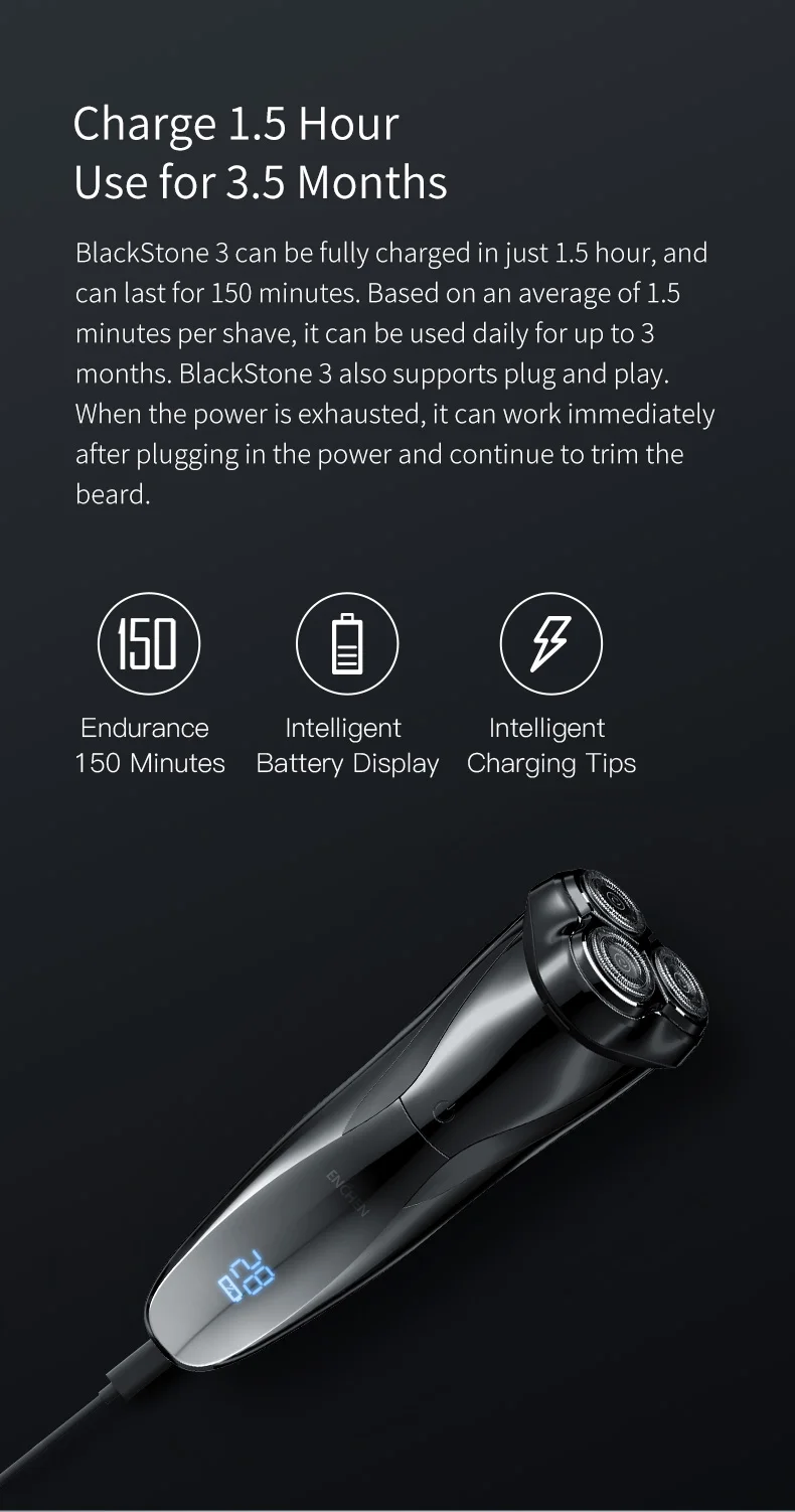 BlackStone 3 может быть полностью заряжен всего за 1,5 часа, а также может работать в течение 150 минут. Исходя из средней 1,5 минут на бритье, он может использоваться для ежедневного ношения до 3 месяцев. BlackStone 3 также поддерживает функцию plug and play. Когда питание измотано, оно может работать сразу же после включения питания и продолжать обрезать бороду.