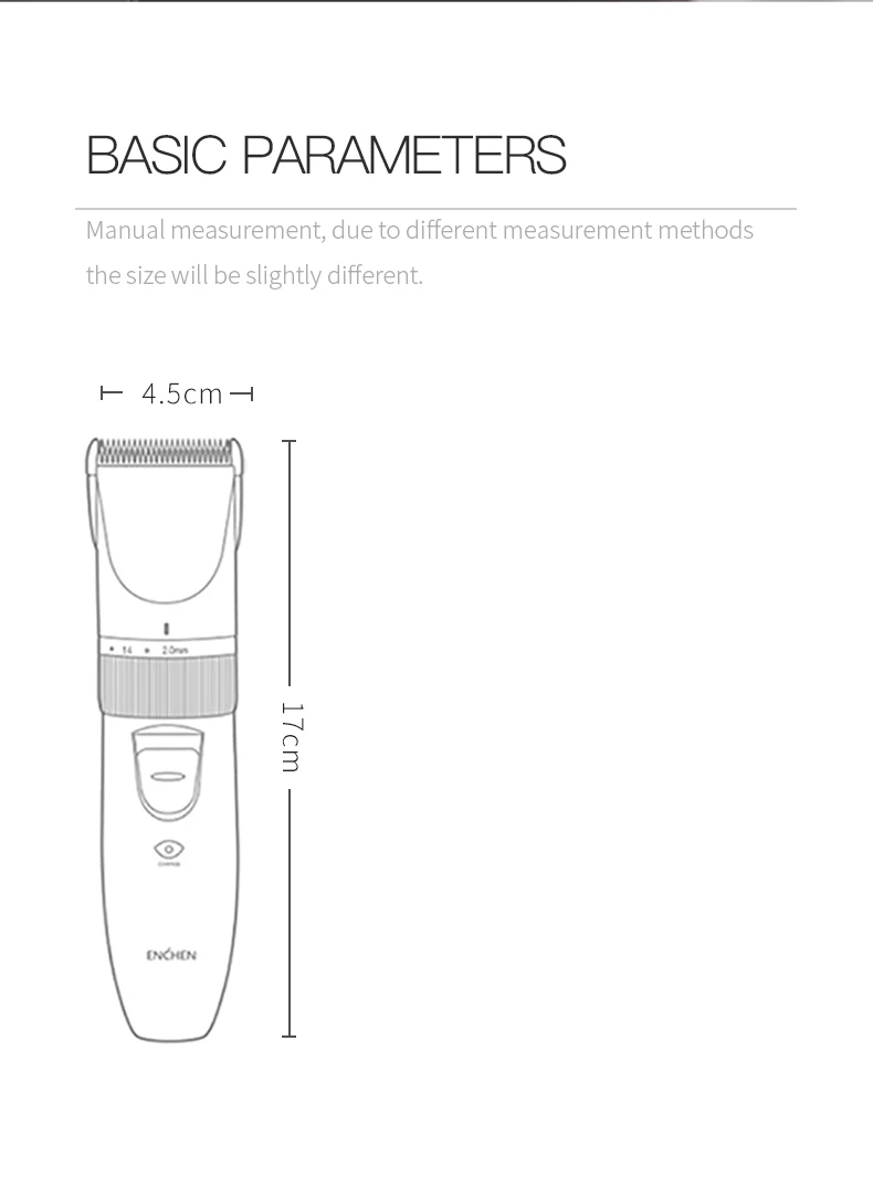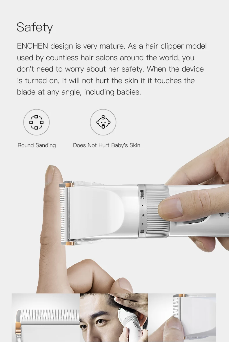 Дизайн ENCHEN очень зрелый. Как модель машинки для стрижки волос, используемая в бесчисленных парикмахерских по всему миру, вам не нужно беспокоиться о ее безопасности. Когда устройство включено, оно не повредит кожу, если она коснется лезвия под любым углом, включая детей. ● Круглый шлифовальный станок ● Не повреждает кожу ребенка