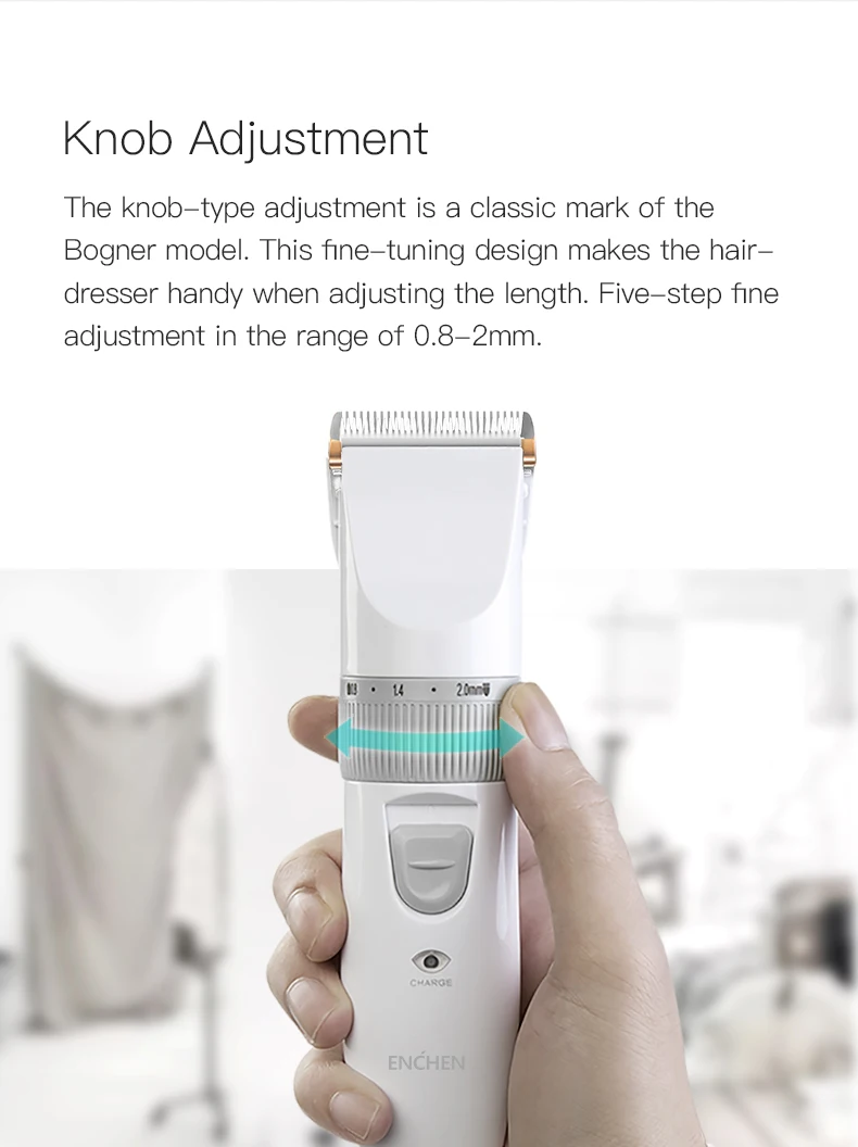 Регулировка типа ручки-это классический знак модели Bogner. Эта тонкая конструкция делает парикмахерскую удобной при регулировке длины. Пятиступенчатая точной регулировки в пределах 0,8-2 мм.