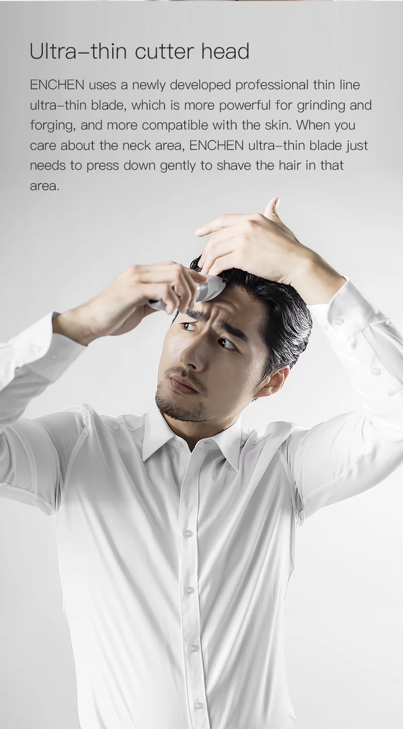 ENCHEN использует недавно разработанное профессиональное тонкое ультратонкое лезвие, которое более мощно для измельчения и ковки и более Совместимо с кожей. Когда вы заботитесь о области шеи, ENCHEN ультратонкое лезвие просто нужно слегка прижать, чтобы побрить волосы в этой области.