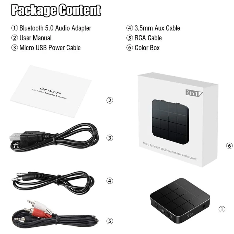[Broad Compatibility]With the included 3.5mm cable and 3.5mm to 2RCA cable, this Receiver Transmitter adapter can widely be used on your computer (does not apply to Linux systems), laptop, home stereo system, headphone, smartphone, Mp3 player, CD player, etc