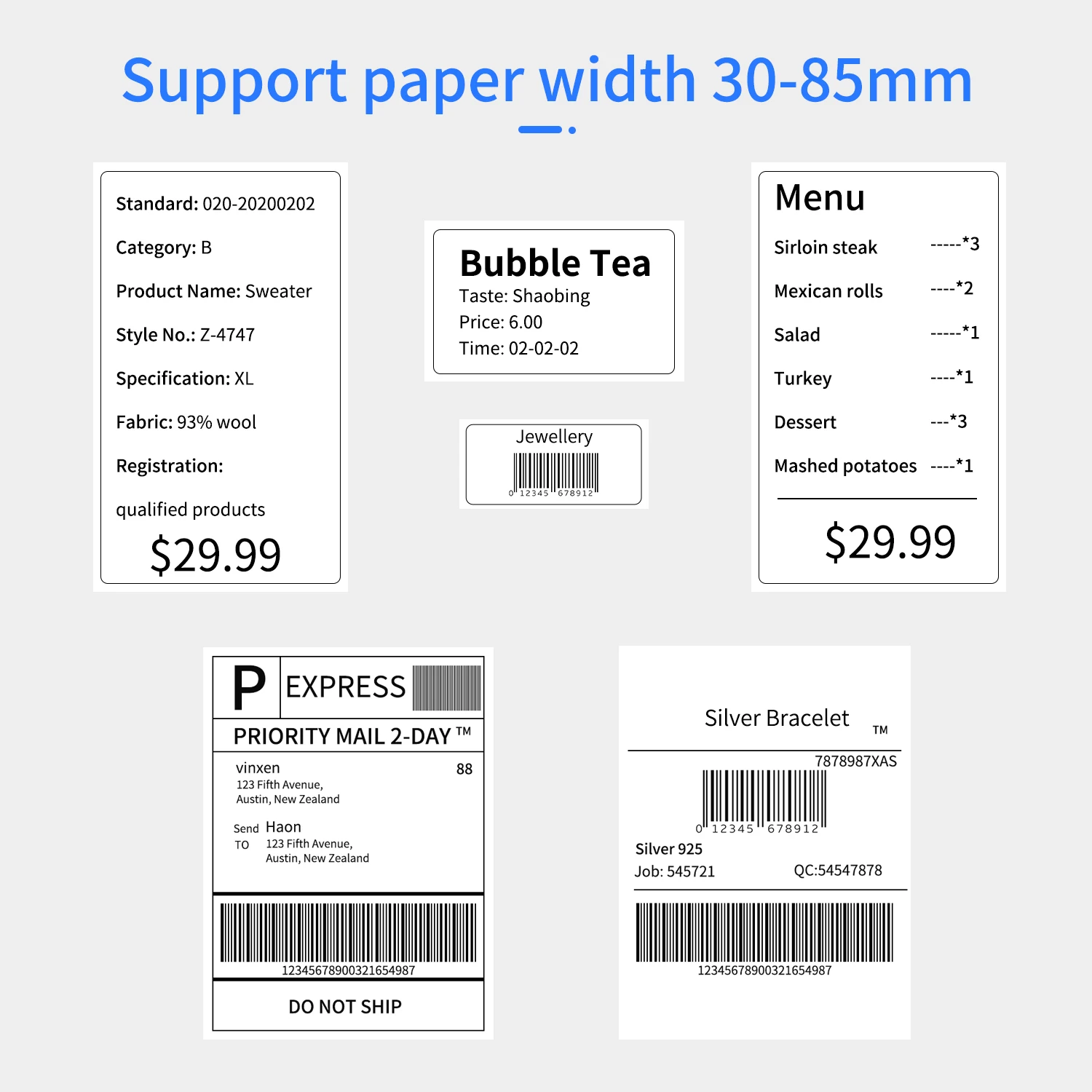 Поддержка печати рулонной этикетки, fan-fold этикетки. Принтер может напечатать бумагу шириной 30-85 мм. Подвижный датчик, который может быстро найти бумагу, убедитесь, что положение печати является точным.