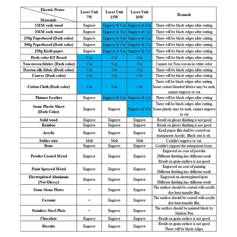● Электрическая мощность лазерного модуля: 7 Вт, 15 Вт, 20 Вт