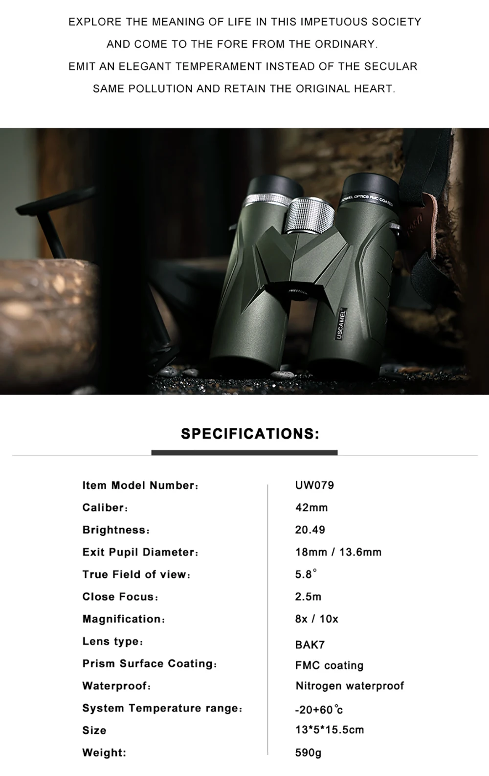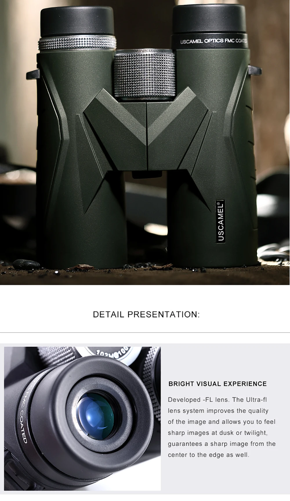 USCAMEL является лидером отрасли в области высокопроизводительной спортивной оптики уже более 10 лет. Основной принцип компании заключается в том, чтобы обеспечить Высочайшее качество, самое надежное и самое доступное Спортивное оптическое оборудование и самое отличное обслуживание клиентов на рынке. Лески USCAMEL улучшают удовольствие от любого уличного погоня, в том числе от изучения природы, охоты, рыбалки, птицеводства и звезд. В помещении Монокуляры/бинокли компании приближают зрителей к действию в быстродвижущихся видах спорта или изобразительном искусстве в театрах и концертах.