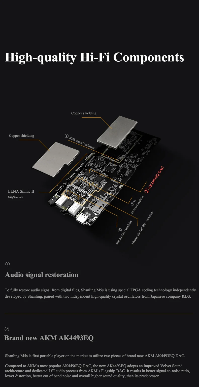 Описание: Больше и ярче В Shanling M5s используется большой 3,2 дюймовый сенсорный экран от LG, улучшая яркость и точность управления. Изогнутое стекло и гладкий металлический корпус Этот дизайн обеспечивает надежный и удобный захват. Олеофобное и гидрофобное покрытие, уменьшающее размазки отпечатков пальцев. Встроенный Wi-Fi для новых возможностей Поддержка DLNA * и AirPlay для наиболее практичной музыки с вашего телефона или компьютера. Подключите Shanling M5s к другим устройствам и наслаждайтесь качественным воспроизведением любых хранящихся файлов сервисов потоковой передачи музыки. Благодаря обновлениям OTA (Over The Air) вам больше никогда не придется пользоваться компьютером для обновлений фирмы. Подключите Shanling M5s к Wi-Fi, и ваше устройство будет Обновлено до последней версии всего одним нажатием * В настоящее время Shanling M5s поддерживает только класс DMR DLNA Подключение по Bluetooth высочайшего качества Shanling M5s Поддержка SONY LDAC / Qualcomm aptX / AAC Двустороннее соединение по Bluetooth Подключайте Shanling M5s к любой Bluetooth-колонке и наушникам для беззаботного беспроводного прослушивания. Или используйте Shanling M5s в режиме Bluetooth-приемника *, просто Выполните сопряжение с телефоном или планшетом и наслаждайтесь музыкой, фильмами, Spotify, Tide или даже Youtube с высоким качеством звука. * Режим приемника ограничен Кодеками SBC, AAC и LDAC. Высококачественные Hi-Fi компоненты Восстановление аудиосигнала: для полного восстановления аудиосигнала из цифровых файлов Shanling M5s использует специальную технологию кодирования FPGA, независимо разработанную Shanling, в паре с двумя независимыми высококачественными кварцевыми осцилляторами от Japanese comany KDS. Совершенно новый AKM AK4493EQ: Shanling M5s-первый портативный плеер на рынке, использующий два абсолютно новых AKM AK4493EQ DAC. По сравнению с самым популярным AKM ЦАП AK4490EQ, в новом AK4493EQ используется Улучшенная бархатная звуковая архитектура и выделенный звуковой процесс LSI от флагманского ЦАП AKM. Это приводит к лучшему соотношению сигнал-шум, более низким искажениям, лучшему наружному шуму и в целом более высокому качеству звука, чем его предшественник. Фильтрация нижних частот: использование двух двухканальных операционных усилителей TI OPA1612 с полностью независимыми схемами для достижения минимального перекрестного распознавания и нулевого взаимодействия между каналами. Цепь усилителя: два двойных операционных усилителя ADI AD8397 с низким уровнем искажений и высоким выходным током обеспечивают чистый и высокодинамический выход, с достаточной мощностью даже для требовательных наушников для аудиофилов. Экранирование: чтобы предотвратить нежелательные шумовые помехи и электромагнитное излучение от влияния на производительность звука, части звуковой цепи соединены с двумя медными пластинами. Сбалансированный выход Четырехканальный LPF, четырехканальный усилитель и Двойной ЦАП образуют полностью сбалансированную схему, обеспечивая значительно повышенную мощность, более высокое разрешение, улучшенное Разделение каналов, более точное воспроизведение деталей и в целом более приятное качество звука. Улучшенный MTouch 2,0 В Shanling M5s используется новая операционная система MTouch 2,0, разработанная Shanling. Основываясь отзывы Вах пользователей от MTouch 1,0, были добавлены различные жесты, чтобы каждый день пользоваться гораздо удобнее и удобнее. Новые короткие стрижки, настраива