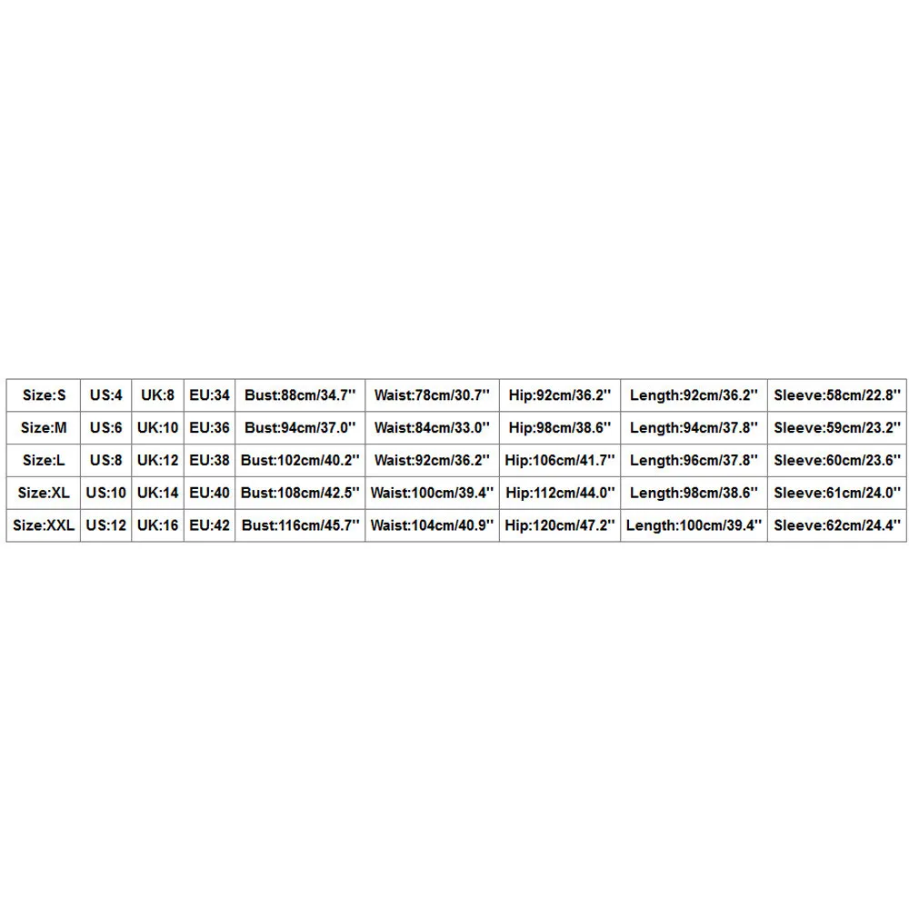 Размеры США UK ЕС Бюст Талия Бедра Длина Рукав S 4 8 34 88 см/34,7 дюйма 78 см/30,7 дюйма 92 см/36,2 дюйма 92 см/36,2 дюйма 58 см/22,8 дюйма М 6 10 36 94 см/37,0 дюйма 84 см/33,0 дюйма 98 см/38,6 дюйма 94 см/37,8 дюйма 59 см/23,2 дюйма L 8 12 38 102 см/40,2 дюйма 92 см/36,2 дюйма 106 см/41,7 дюйма 96 см/37,8 дюйма 60 см/23,6 дюйма XL 10 14 40 108 см/42,5 дюйма 100 см/39,4 дюйма 112 см/44,0 дюйма 98 см/38,6 дюйма 61 см/24,0 дюйма XXL 12 16 42 116 см/45,7 дюйма 104 см/40,9 дюйма 120 см/47,2 дюйма 100 см/39,4 дюйма 62 см/24,4 дюйма