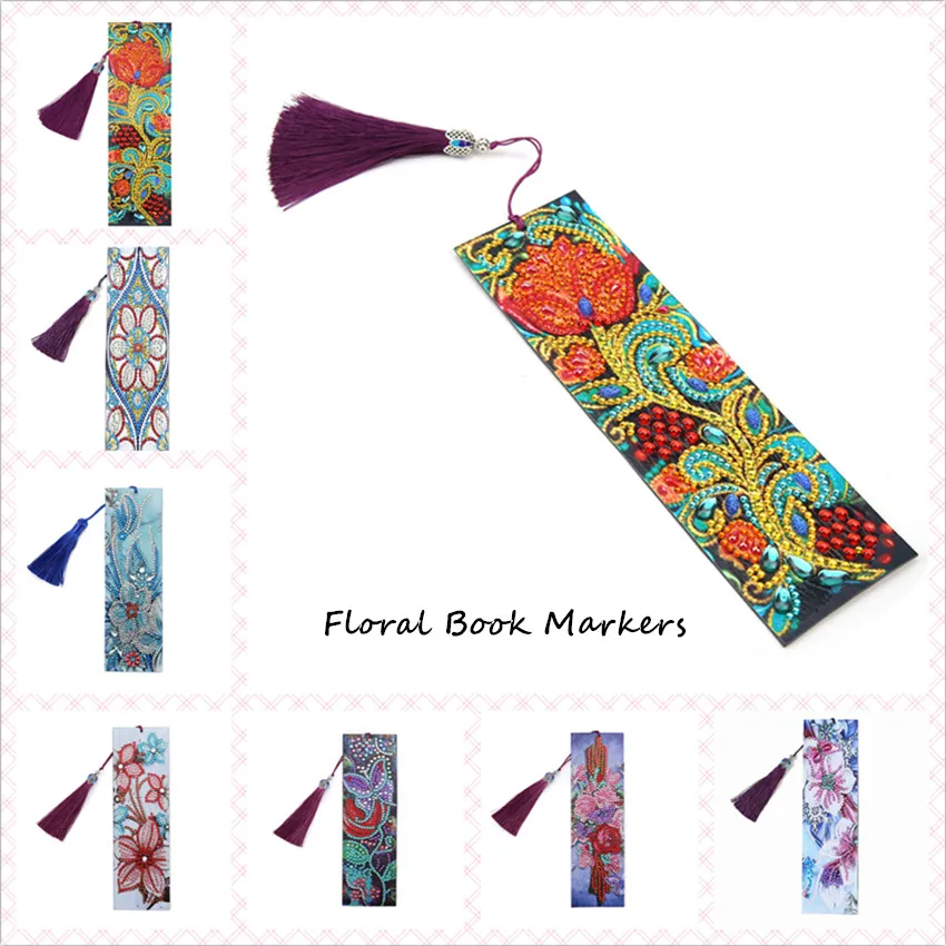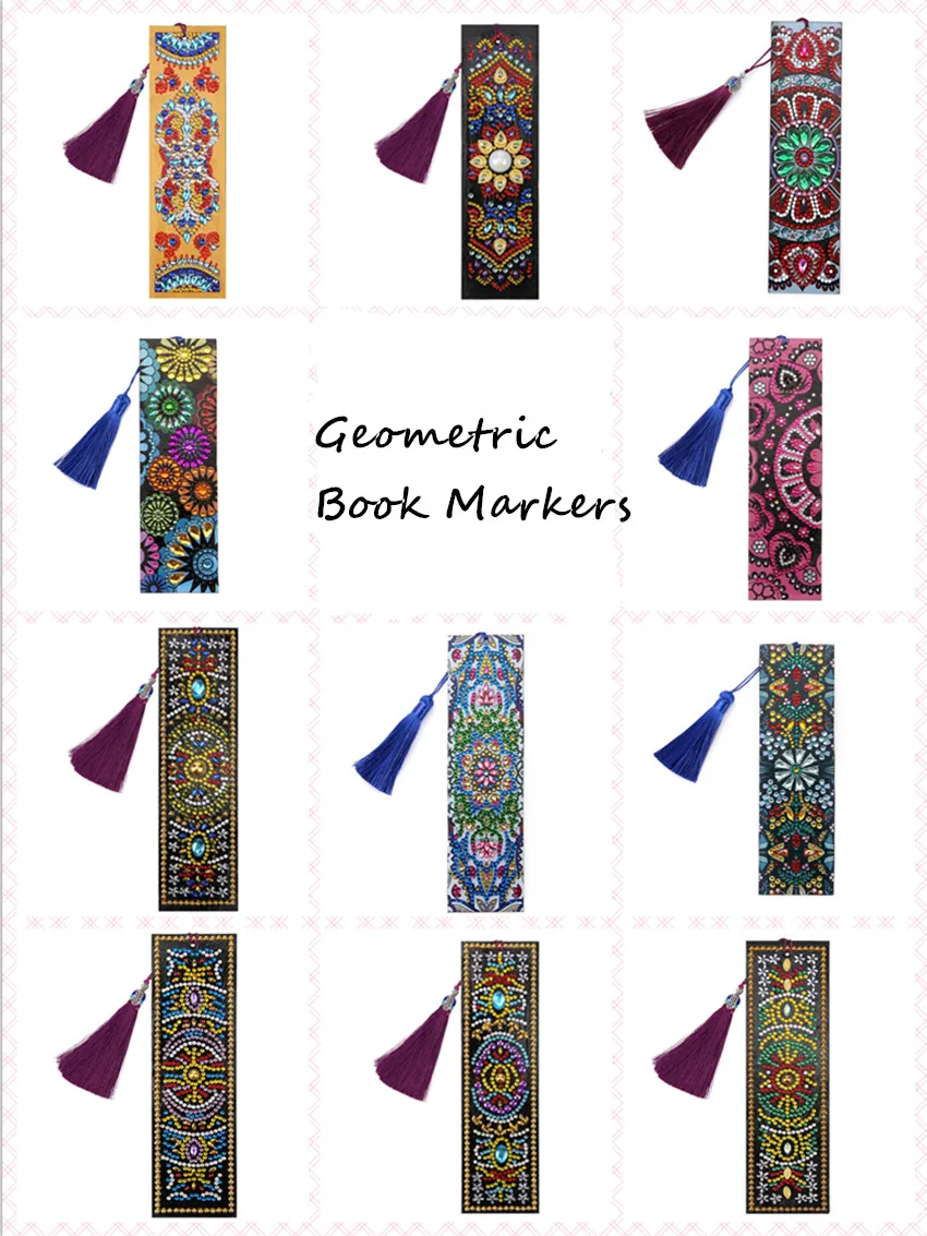 Это серийные закладки из искусственной кожи с 3D рисунком, украшенными различными темами, включая животные, цветы и геометрические фигуры. Узоры сделаны из красочных искусственных алмазов особой формы. Бриллианты сделаны из полимерного материала с множеством разных секций, которые делают рисунок блестящим и стереоскопическим.