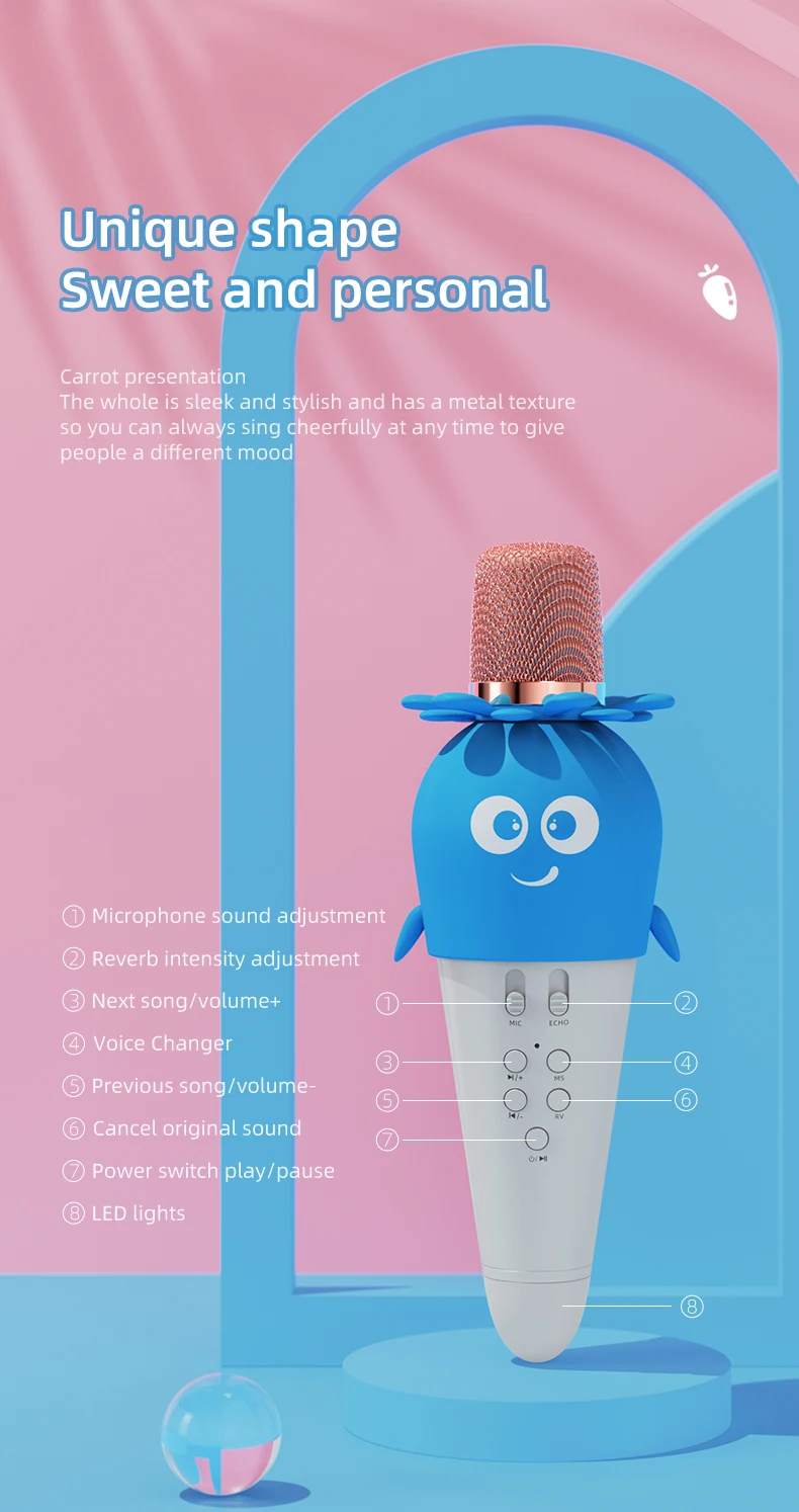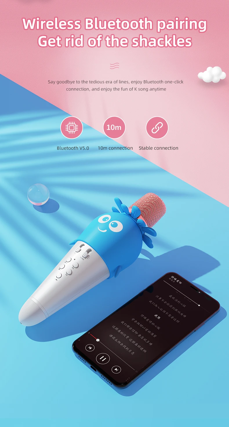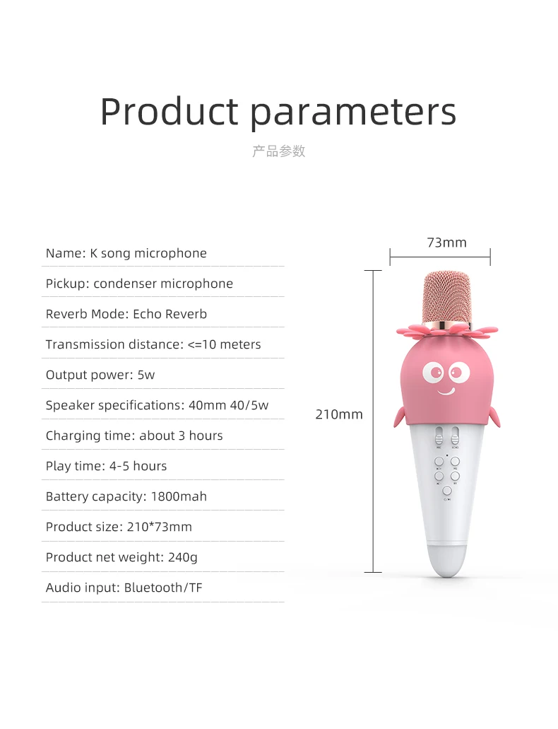 Характеристики: Название бренда: YARMEE Название: микрофон K song Номер модели: YKM03 Цвет: синий, оранжевый, розовый Преобразователь: конденсатор Полярные узоры: кардиоид Связь: Беспроводная Режим реверберации: Эхо реверберация Расстояние передачи: <= 10 метров Выходная мощность: 5 Вт Характеристики динамика: 40 мм 40/5 Вт Время зарядки: около 3 часов Время работы: 4-5 часов Емкость аккумулятора: 1800 мАч Размер изделия: 210*73 мм Вес нетто продукта: 240 г Аудио вход: Bluetooth/TF Особенности: 1. Широкая совместимость может работать без интернета, поддержка bluetooth и tf-карты. 2. Светодиодный яркий свет, более забавный. 3. Встроенный литиевый аккумулятор большой емкости 1800 мАч, полная зарядка может обеспечить около 5 часов работы от батареи. 4. Возьмите микрофон, поющий четкий голос, умный звук чипа лучше, улучшенная большая Подвижная головка катушки HD. 5. Технология беспроводного подключения, мобильный Телефон может быть подключен к двум микрофонам одновременно для достижения двойного пения, парного караоке, принесет вам неограниченное удовольствие. Посылка включает в себя: 1 x Микрофон