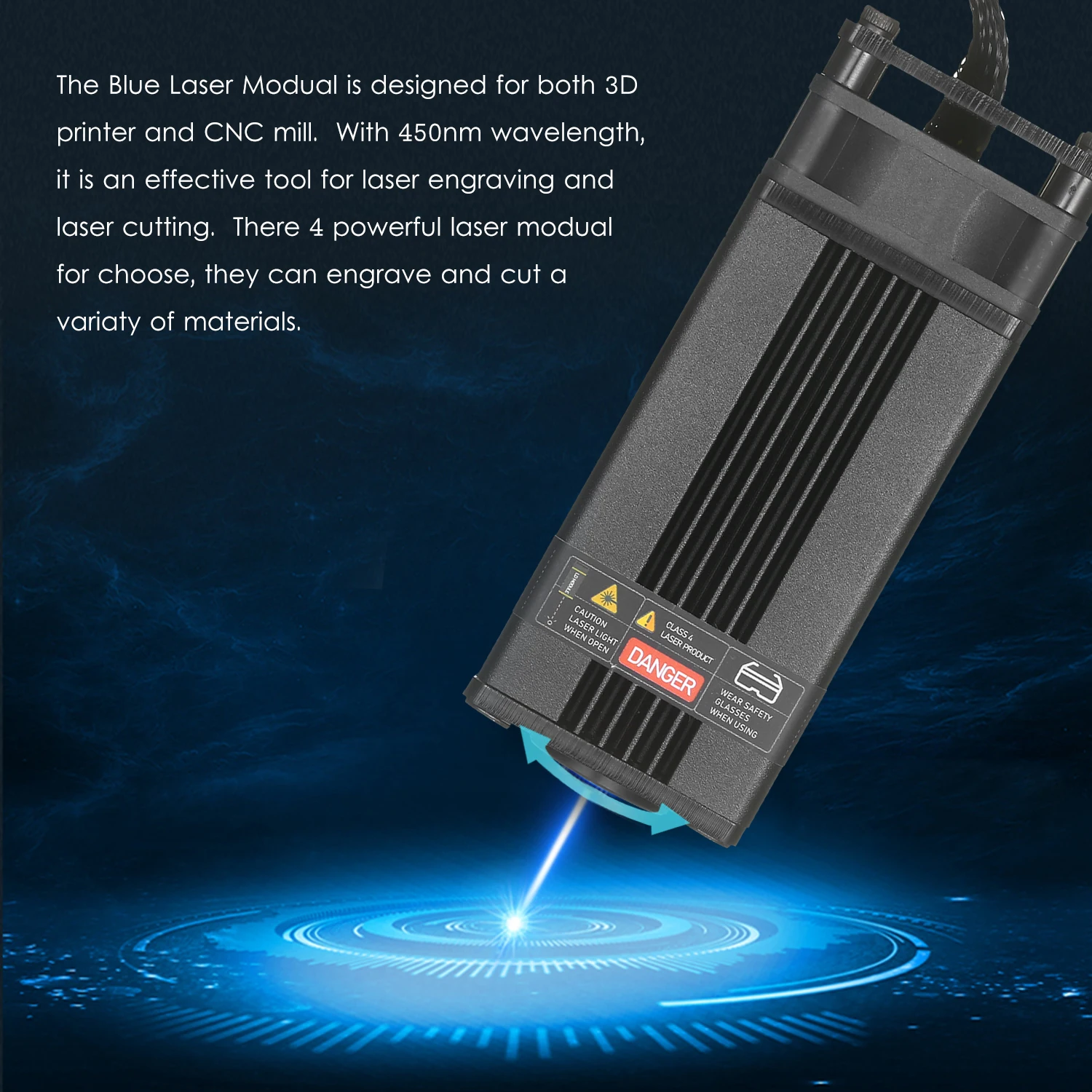 Усовершенствованный синий лазерный модуль с более низкой потерей и высокой точностью предназначен как для 3D-принтера, так и для станка с ЧПУ. С длиной волны 450нм, это эффективный инструмент для лазерной гравировки и лазерной резки. Есть 4 мощных лазера modual на выбор, они могут гравировать и резать различные материалы.