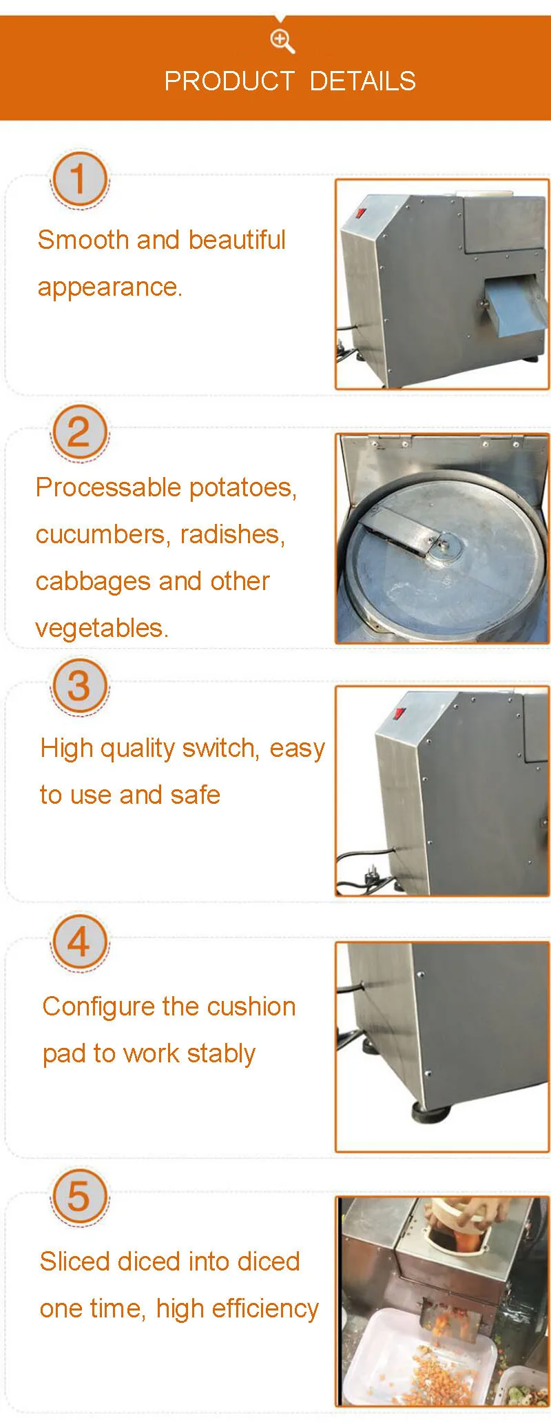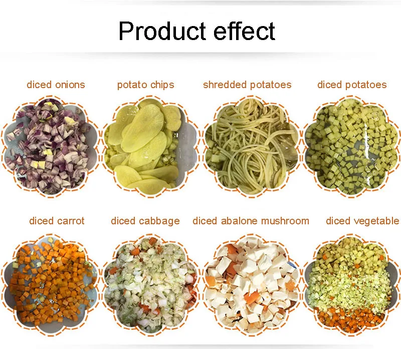 Электрическая машина для нарезки овощей-хороший помощник и торговый автомат для домохозяек и деловых людей. Он используется в различных местах, таких как отели и фермерские дома. Высококачественный материал из нержавеющей стали делает еду очень чистой и сохраняет питательную и вкусную еду. Подходит для картофеля, сладкого картофеля, моркови, редиски, помидоров, боярышника, лука и других овощей.