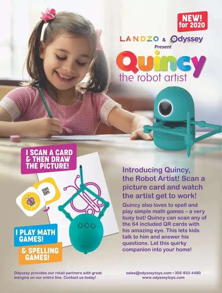 Представляем Куинси, робота-художника! Отсканируйте картинную карту и посмотрите, как художник подходит к работе. Куинси также любит заклинание слов и играть в простые математические игры-очень занятой бот. Куинси может сканировать любые из 64 прилагаемых qr-карт с его удивительным глазом. Это позволяет детям говорить с ним и отвечать на его вопросы.
