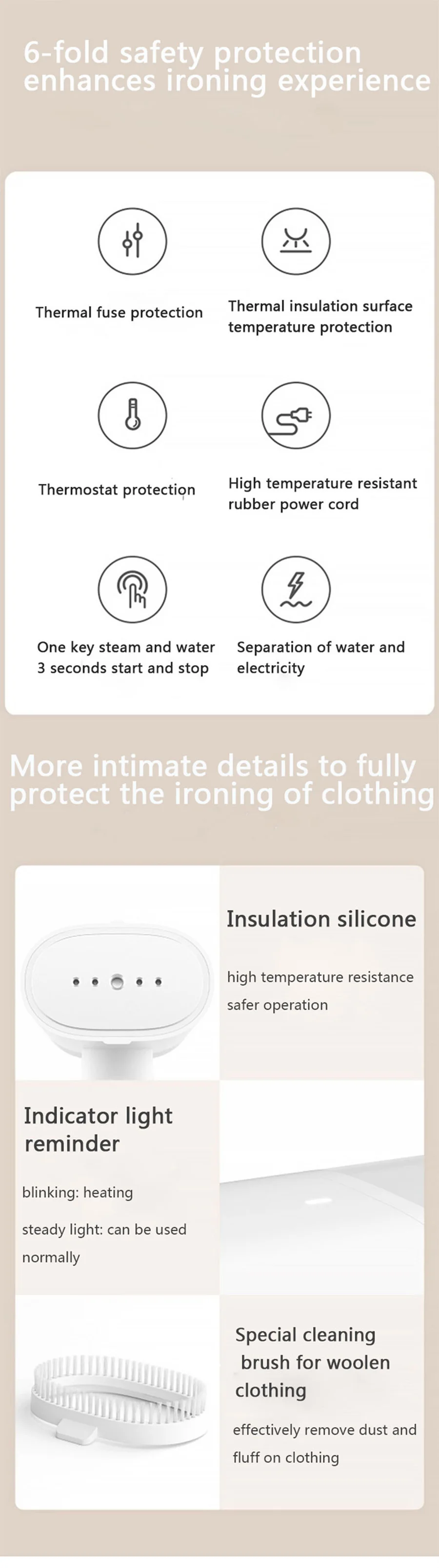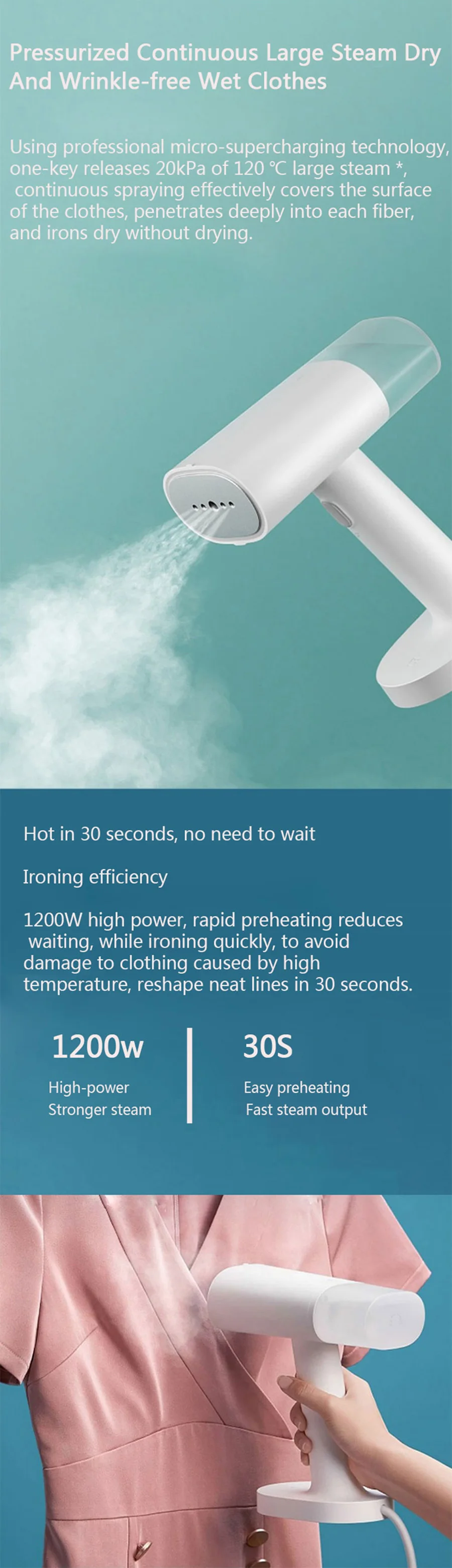-Легкий и портативный, маленький размер для одной руки. -Технология SteamPlus, мощный пар мощностью 1200 Вт, уход за одеждой и эффективное удаление морщин одежды. -Высокоэффективное проникновение в одежду, 22 г/мин пара с высокой температурой и давлением в течение 7-8 минут глажки. -130 ℃ алюминиевая панель и керамическое покрытие не повреждают поверхность одежды. -8 градусов угол наклона тела, профессиональный дизайн для глажки одежды. -Трехслойная защита, умный контроль температуры и предохранитель двухслойная защита и автоматическое отключение при нагревании более 140 ℃. -Поставляется с 2,2 м удлинить шнур питания, маленькая кисть, 150 мл резервуар для воды, индикатор и округлая панель. -Управление одной кнопкой, нет необходимости в других сложных шагов, просто нажмите и начните.