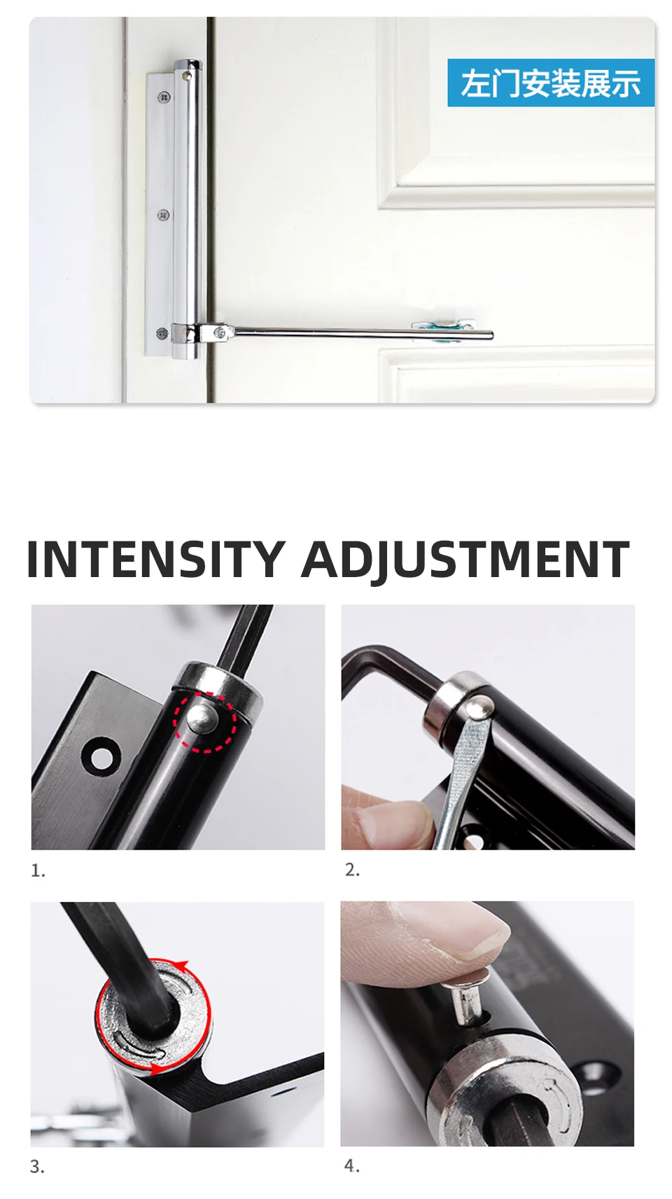 Без рук, автоматическое закрытие, удобно для ежедневного использования. Подходит для любой двери: подходит для семей, отелей, ванных комнат и других дверей. Широкое применение: Дверной доводчик может быть использован на всех алюминиевых передних дверях, деревянных или полых металлических коммерческих дверях. Регулируемая прочность, простота установки. Изготовлен из высококачественного алюминиевого сплава, прочный, устойчивый к коррозии.