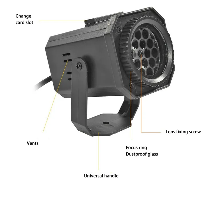1. Корпус изготовлен из высококачественных водонепроницаемых материалов обеспечивает долговечность и длительный срок службы. 2. Светодиодный светильник с проекцией-идеальный светильник vibe для вечерние, семейные, фестивальные и т. Д. Поставляется с 6(A) /16(B) / 20(C) различными проекционными пленками, свободно меняйте на creat различный светильник ing effect. 3. Портативная конструкция. Вы можете положить его на свой стол, и он также может быть установлен на стене или потолке
