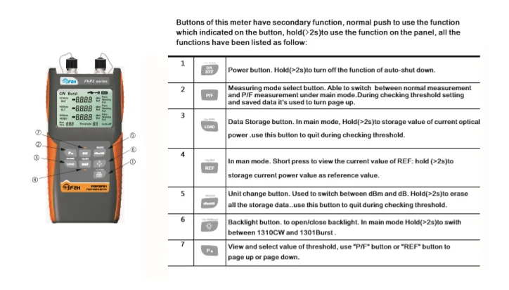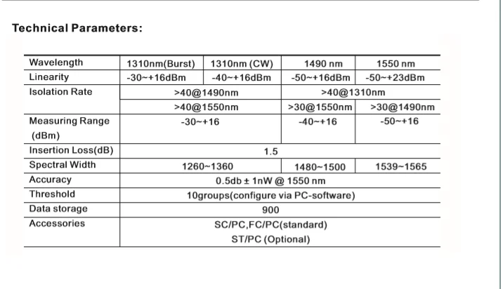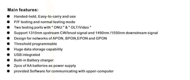 Описание: Fhp2p01 pon измеритель мощности é um tamanho pequeno, baixa perda e de boa qualidade medidor de potência óptica entregue. E projetado para o teste, a instalaçao e a manutençao da rede fttx pon, que pode ser usado para a rede de pon, bpon, epon e gpon. Fhp2p01 tem duas portas de saida para onu e olt/vindeo, que suporta cw/burst a detecçao ascendente em 1310nm e sinal a jusante em 1490/1550nm. Pode mostrar direamente o status da passagem, do aviso ou da falha pelo teste do limiar. Fhp2p01 é a ferramenta ideal para configuraçao e manutençao pon.