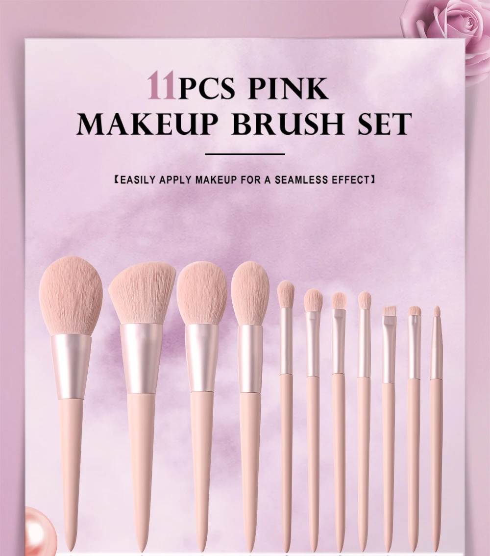 Этот новый розовый комплект из 11 предметов без логотипа, строго подобранные щетинки, текстура близко к коже, не прилипает к коже лица, и на ощупь гладкая и быстрая форма, подходит для ежедневного использования и макияжа новичков