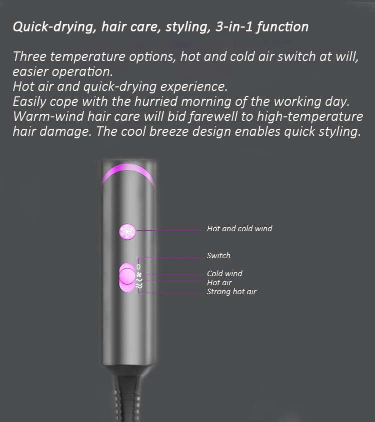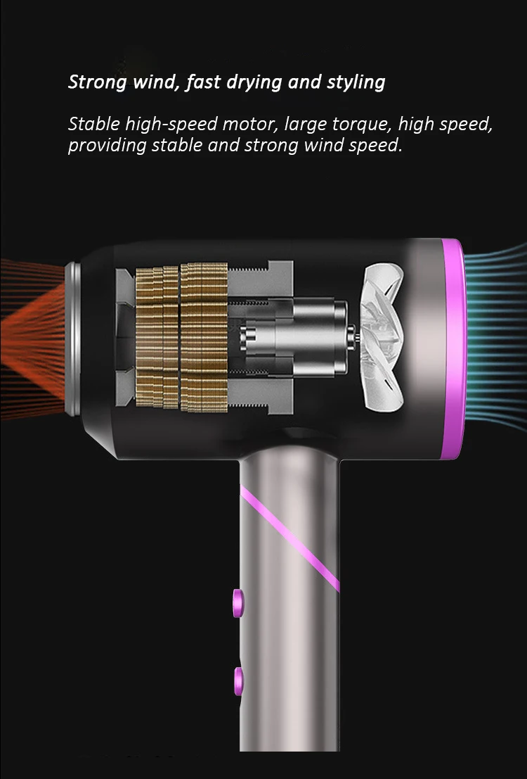 Технология сбора воздуха, широкая структура воздуховода, может выпускать высокоскоростной поток воздуха, при той же функции, ветер большой и концентрированный, с увлажняющими ионами, короткое время сушки, заботясь о ваших волосах, чтобы высвободить отрицательные ионы. Уход за волосами на уровне салона, глубокое питание волос, ремонт чешуи для волос, длительное использование, мягкие и глянцевые волосы.