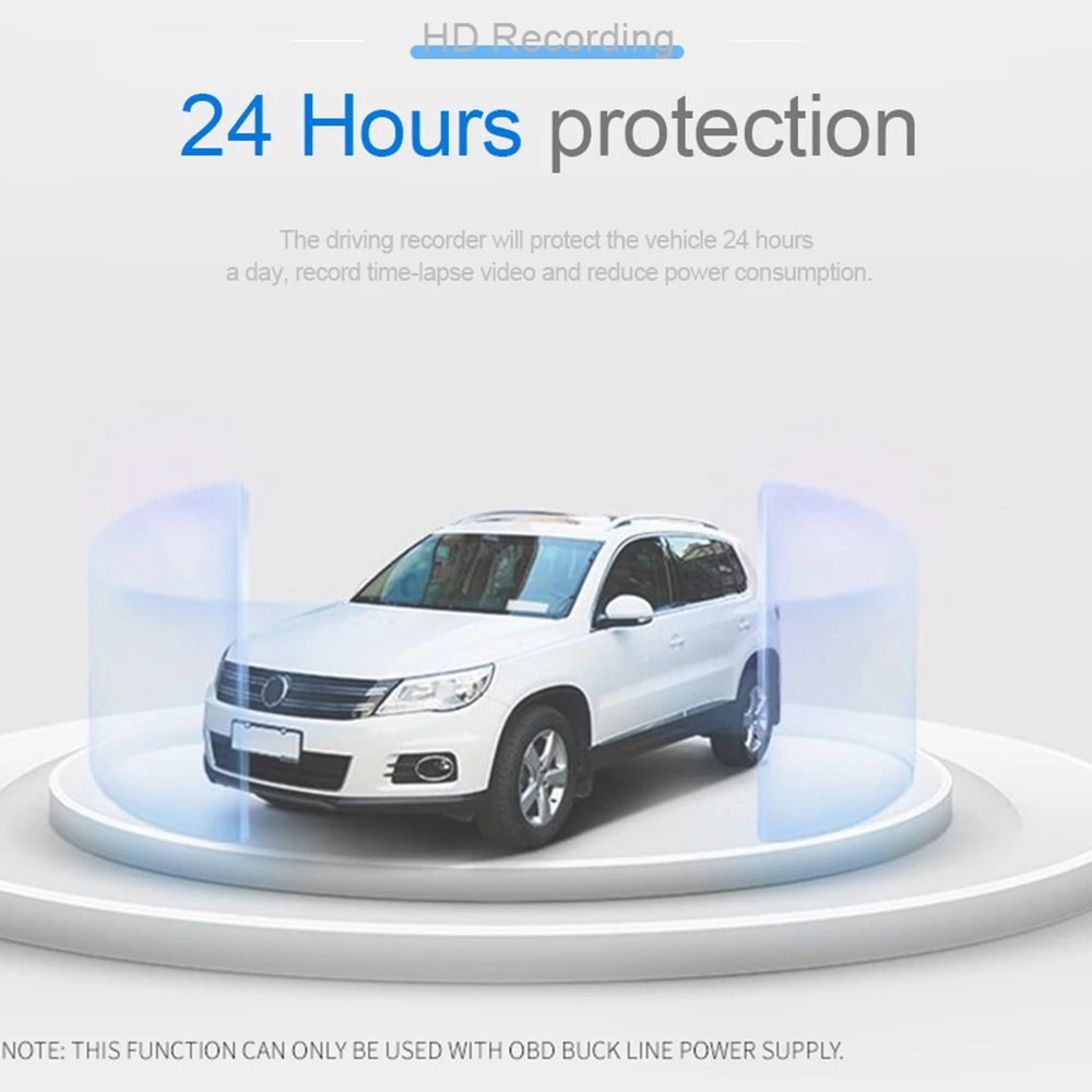 -24 h монитор парковки: если вы беспокоитесь о том, что ваш автомобиль был поврежден другими при парковке, используйте понижающий кабель для подключения видеорегистратора, чтобы гарантировать, что видеорегистратор работает 24 часа в сутки. Если кто-то другой повредит ваш автомобиль, видеорегистратор сразу включится и запишет ситуацию.