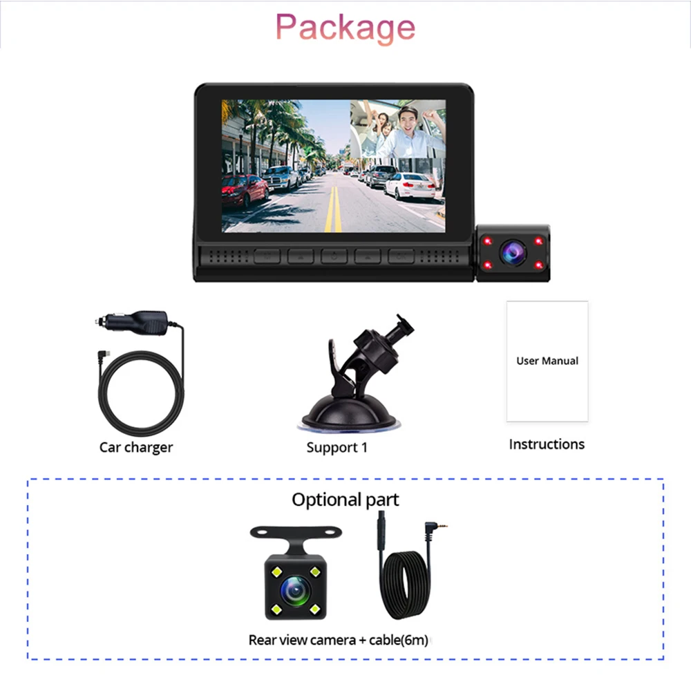 Помимо переднего и заднего вида, вы также можете записывать все, что происходит внутри автомобиля. Можно выбрать другой режим просмотра экрана, запись внутри и снаружи в то же время, большой широкоугольный HD качество изображения с более широким видением.