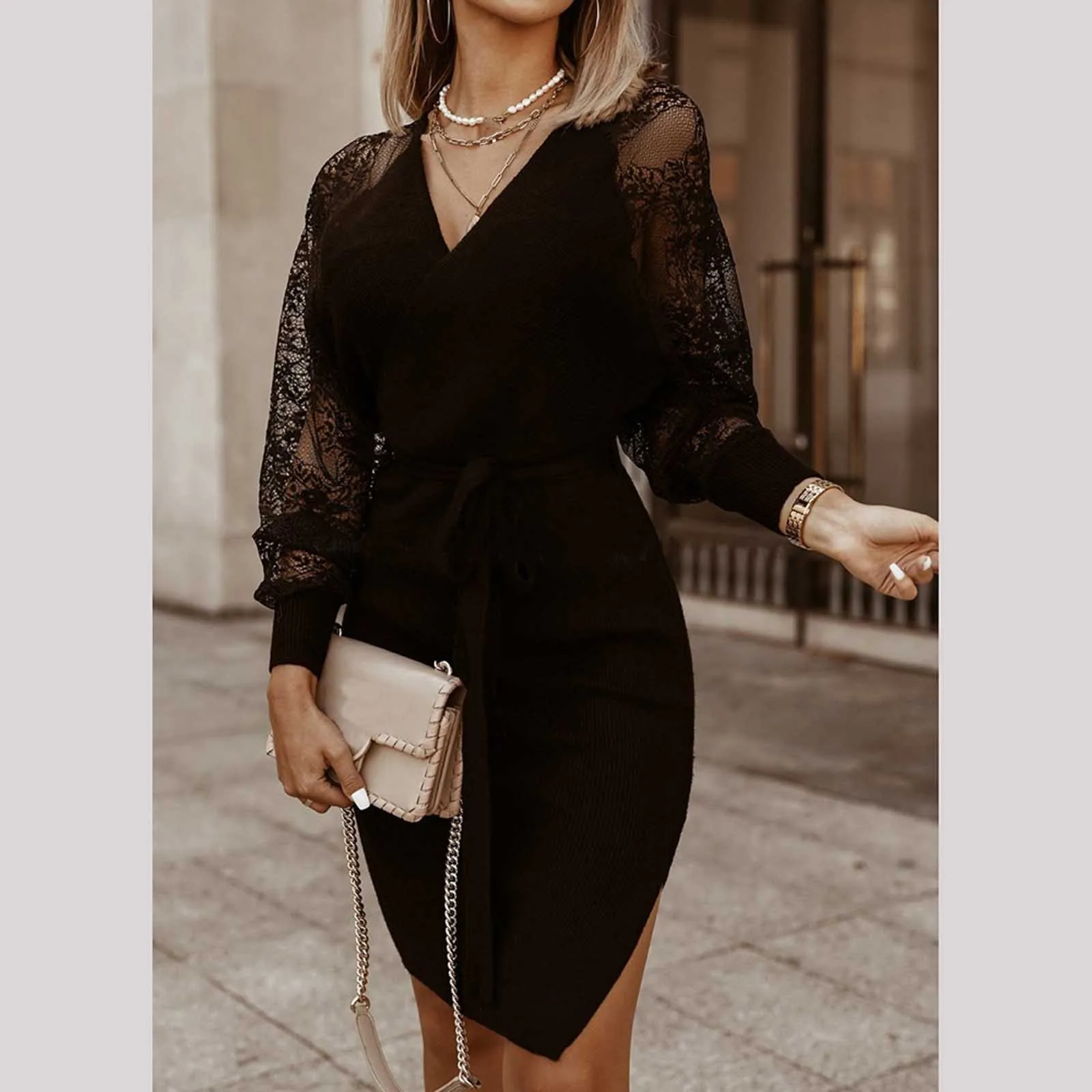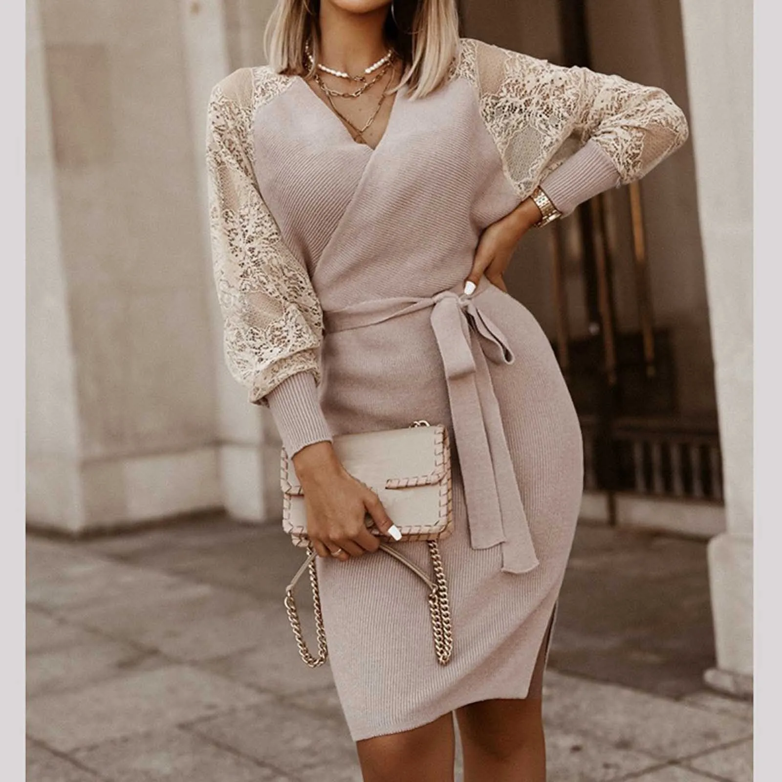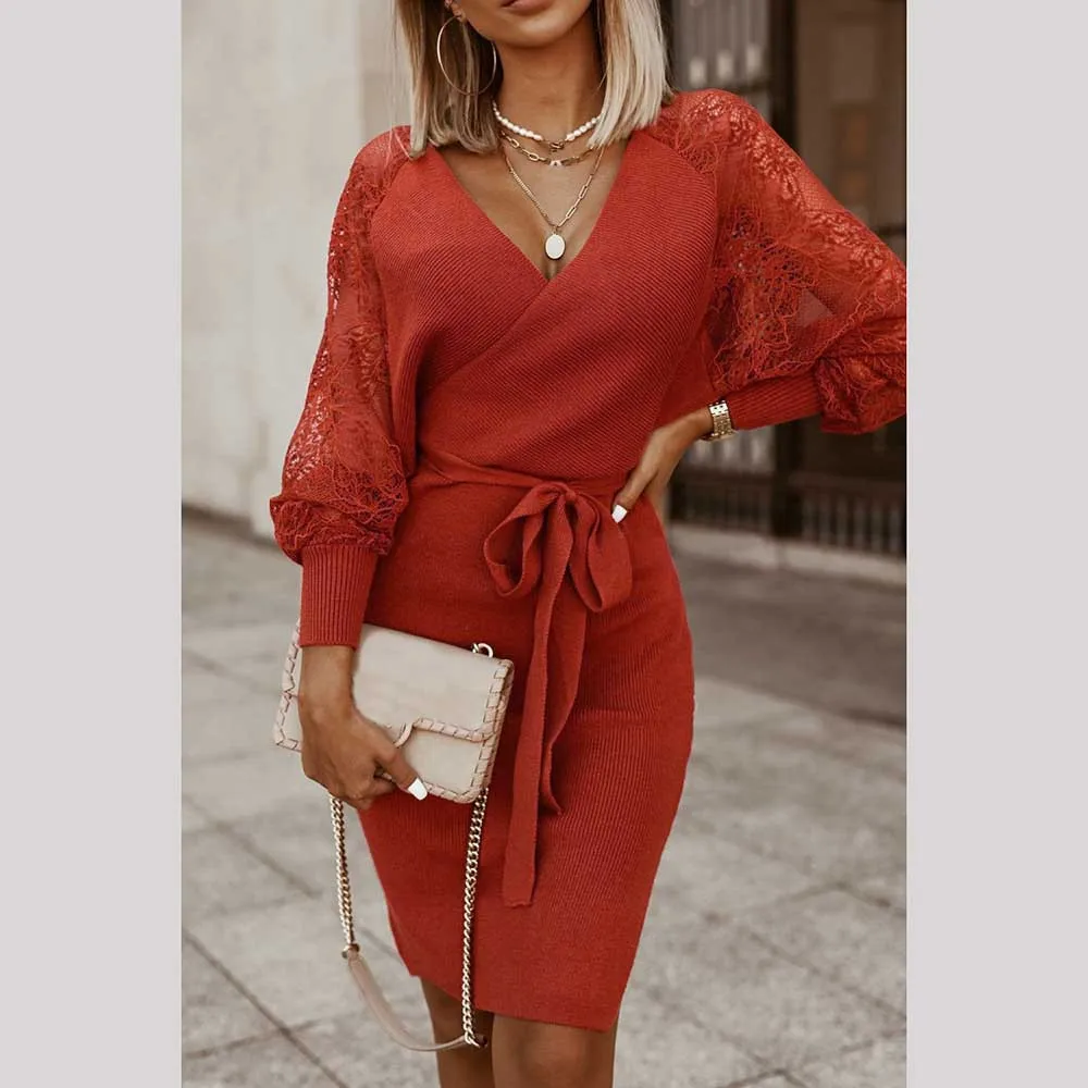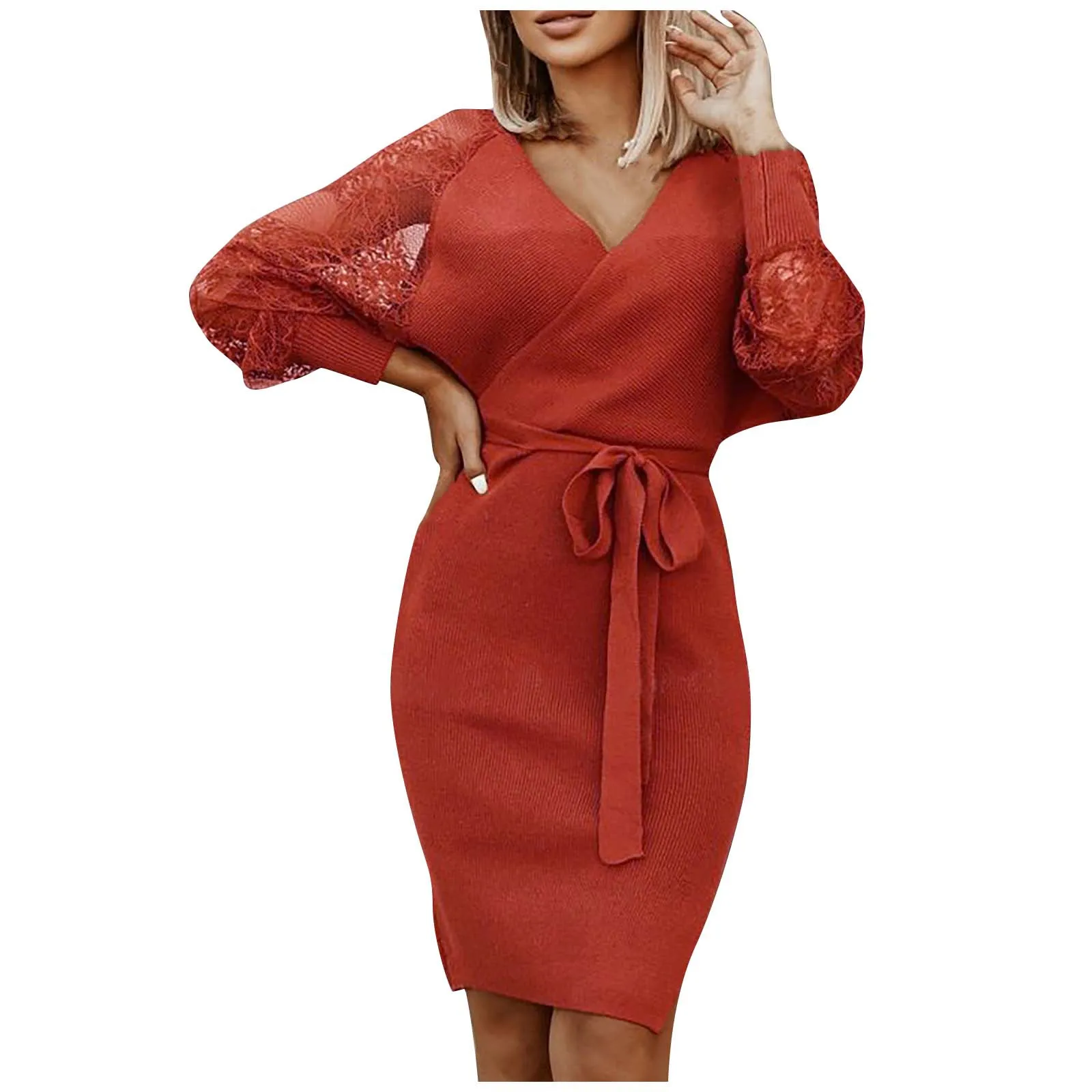 Женское платье, однотонное вечернее платье с V-образным вырезом и кружевом в стиле пэчворк с длинным рукавом