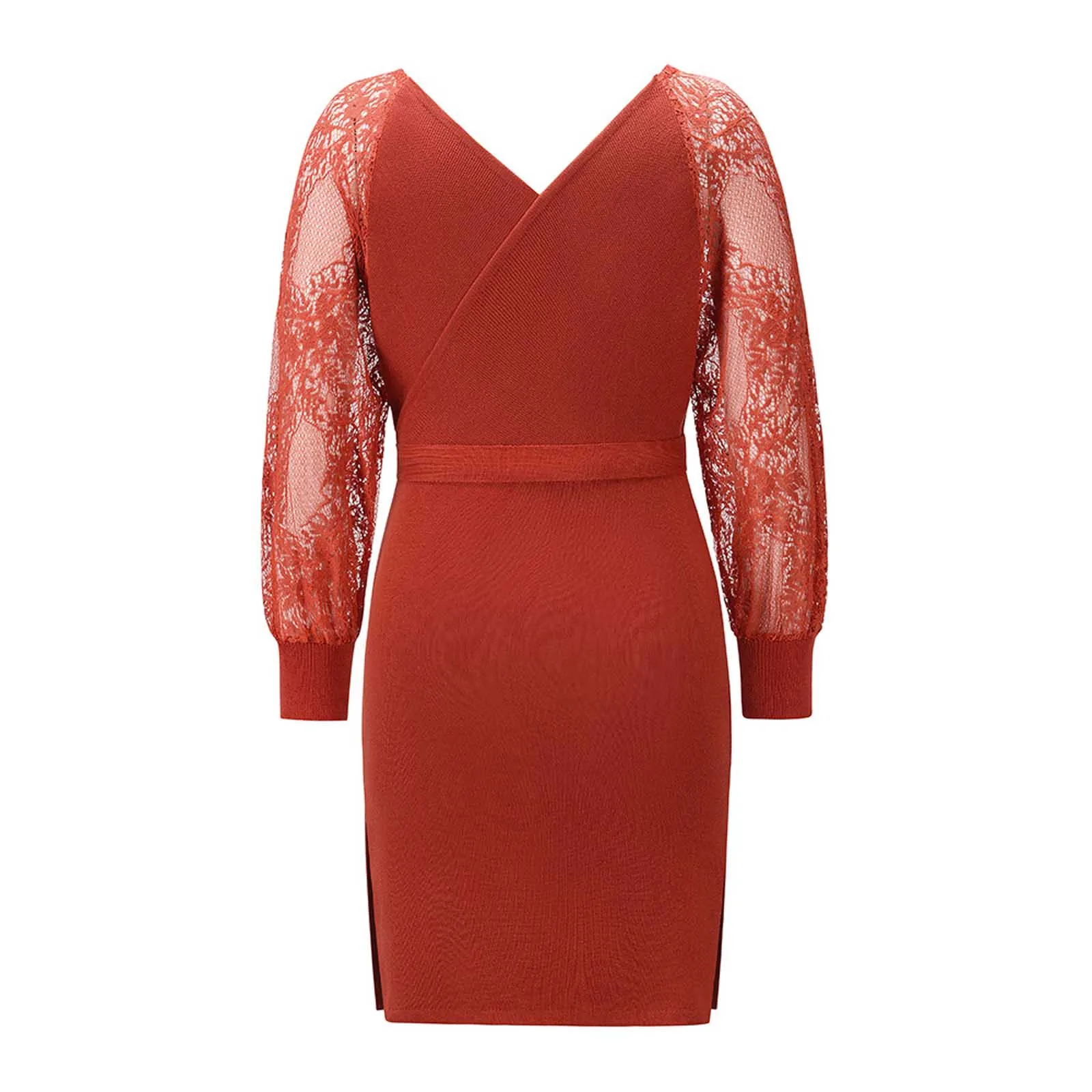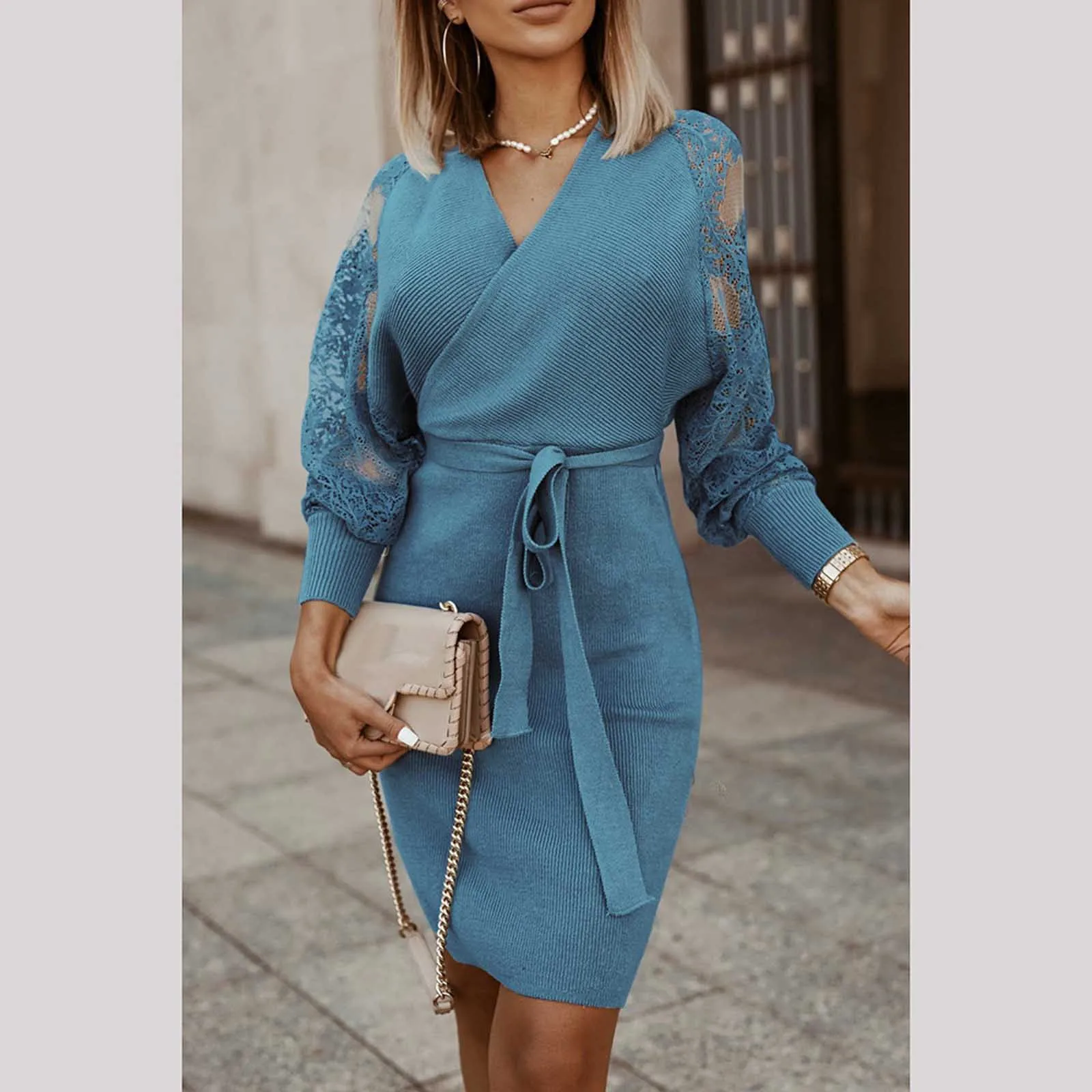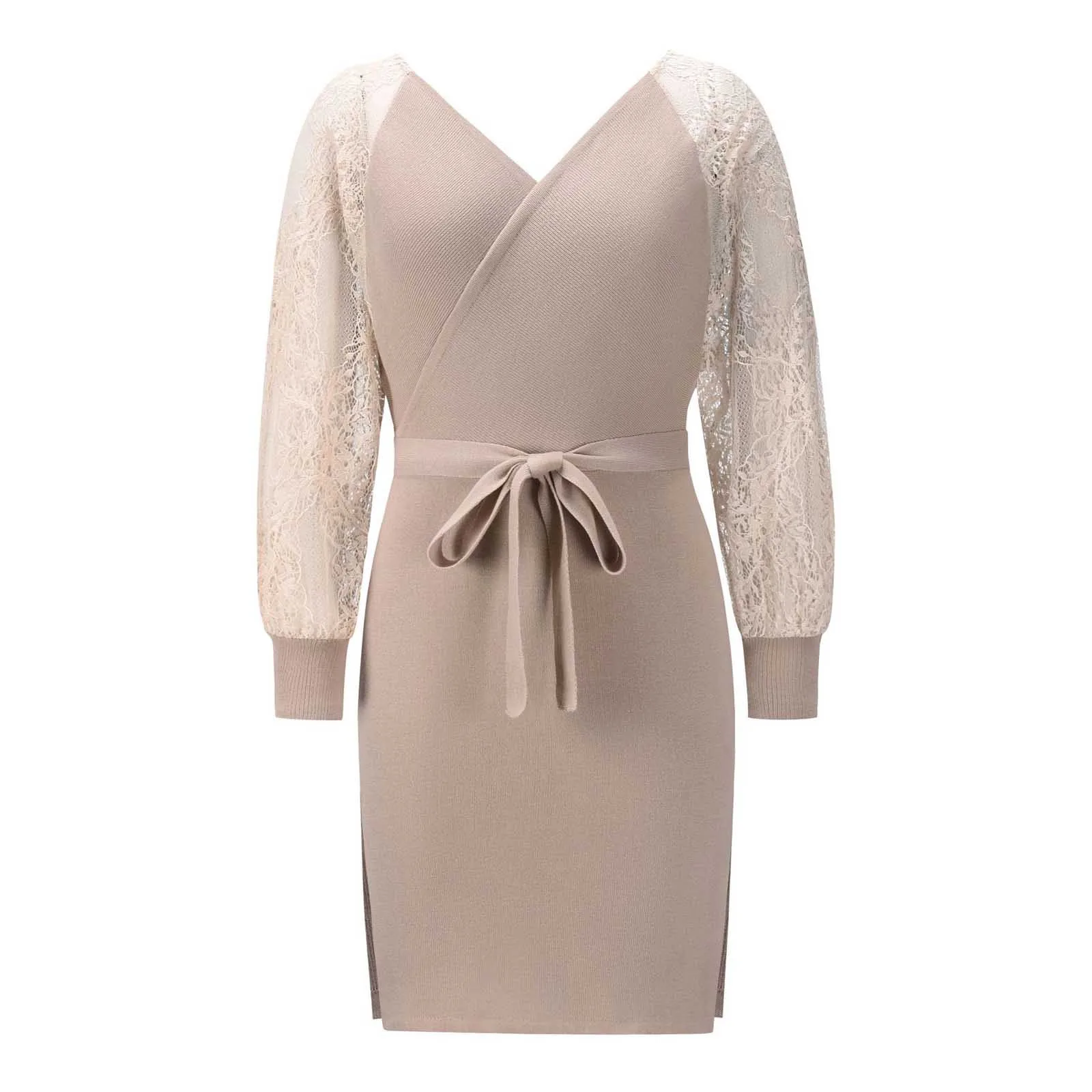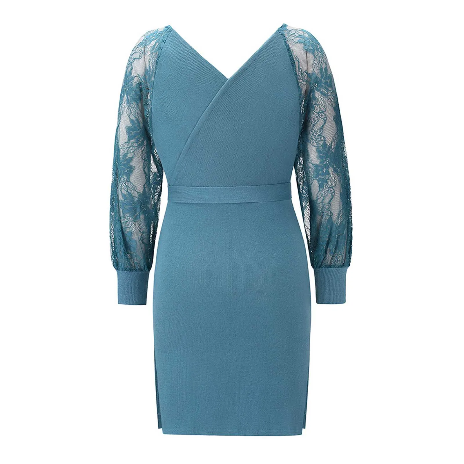 Женское платье, однотонное вечернее платье с V-образным вырезом и кружевом в стиле пэчворк с длинным рукавом