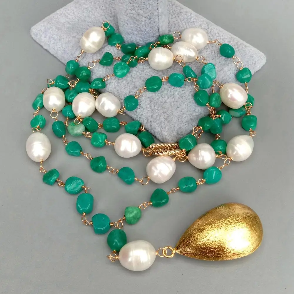 Natural Green Peruvian Amazonite Cultured White Rice Pearl Necklace Teardrop Brushed Gold Plated Pendant 21"