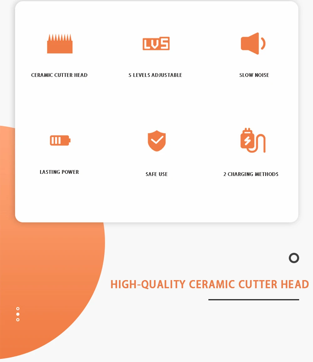1. Перед обрезкой, пожалуйста, очистите сухие волосы и ухаживайте за волосами 2. При использовании машинки для стрижки с пластиковой прикрепляемой расческой вам необходимо часто чистить волосы в расческе, чтобы избежать попадания волос в расческу. Это нормальное явление при использовании прикрепляемого гребня для обрезки.