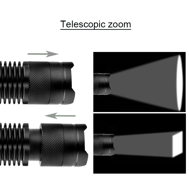 Мини Портативный дизайн, телескопический зум Изготовлен из авиационного алюминиевого сплава прочный HAIII военный класс Жесткий анодированный Использует новейший светодиодный индикатор CREE для максимальной выходной мощности до 3000-5000 Имеет пиковую интенсивность луча 10000cd и расстояние броска до 350-500 метров Используйте 1 перезаряжаемый аккумулятор Водонепроницаемый в соответствии с IPX-6 Три светодиода, два размера на выбор.Параметр