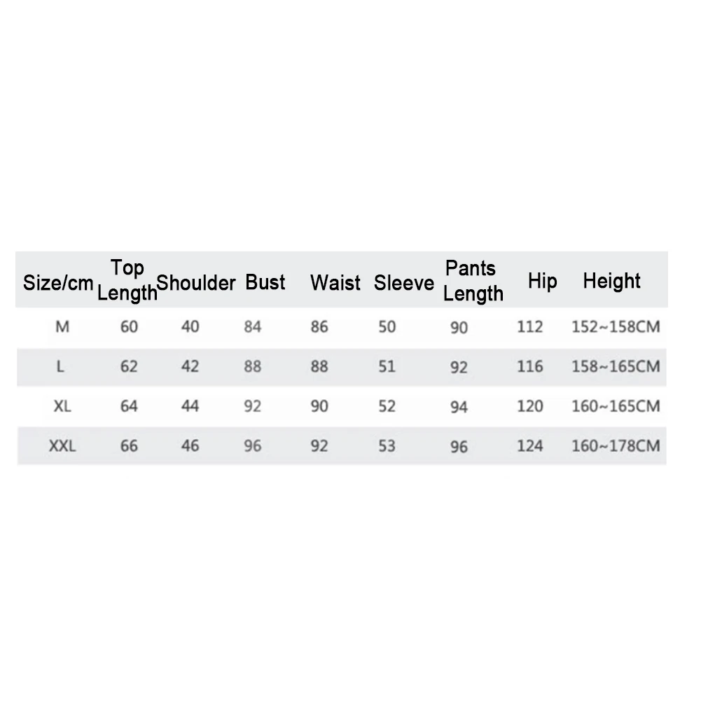 [Наш Размер L] Длина топа: 62 см/24,41 дюйма, Плечи: 42 см/16,54 дюйма, обхват груди: 88 см/34,65 дюйма, обхват талии: 88 см/34,65 дюйма, рукав: 51 см/20,08 дюйма, длина брюк: 92 см/36,22 дюйма, обхват бедер: 116 см/45,67 дюйма (прибл.)