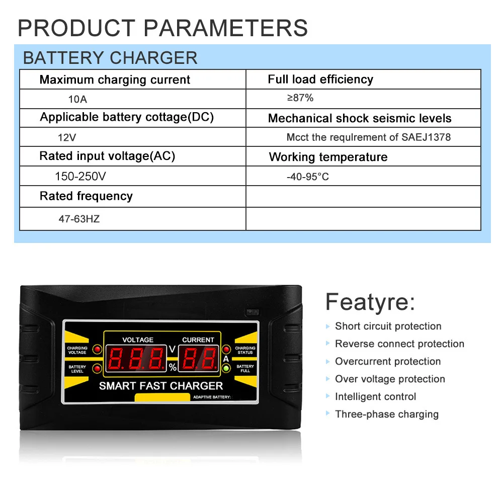 Это автоматическое автомобильное зарядное устройство, которое может заряжать аккумулятор в зависимости от состояния аккумулятора! Он использует контроллер MCU для сохранения и быстрой зарядки вашего аккумулятора! Режим постоянного тока: Когда напряжение батареи ниже, чем значение, установленное зарядным устройством, зарядное устройство будет работать в режиме постоянного тока и поставлять постоянный ток для аккумулятора. Режим постоянного напряжения: Использование технологии модуляции ширины импульса (PWM) для контроля тока зарядки и выходного напряжения зарядного устройства, что обеспечивает полную зарядку аккумулятора и позволяет избежать чрезмерной зарядки. Плавающий режим зарядки: Когда напряжение батареи приближается к значению режима постоянного напряжения, и ток будет постепенно сокращаться до данного тока, это означает, что мощность аккумулятора полная, затем Пилотная лампа станет зеленой, и вентилятор перестанет работать. Зарядное устройство автоматически превратит режим в плавающий режим зарядки. В данный момент аккумулятор можно прекратить зарядку или держать на плавающей зарядке в течение получаса. Описание: Функция испарения Функция автоматической стружки Функция защиты от зарядки Функция защиты от перенапряжения Мощность и энергия Защита от короткого замыкания Функция короткого запуска перезарядки Широкий диапазон напряжения ЖК-дисплей Штепсельная Вилка европейского стандарта или штепсельная вилка стандарта США (на выбор) Режим зарядки: трехфазный (режим зарядки ШИМ) Включает в себя постоянную фазу зарядки, постоянную зарядку напряжения Фаза, плавающая фаза зарядки