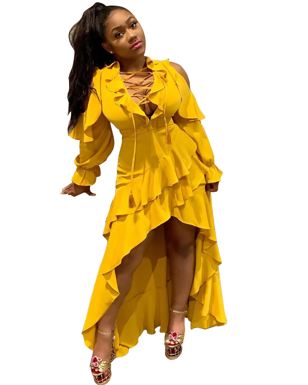 Каскадные оборки, сексуальное асимметричное Бандажное платье, женское кружевное платье на завязках с длинным рукавом, Осеннее короткое длинное платье с открытой спиной