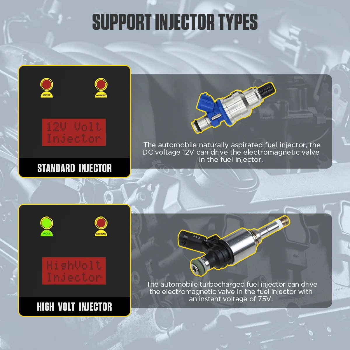 AUTOOL CT60 используется для тестирования автомобильных инжекторов, чтобы определить, застревают ли топливные инжекторы, протекают или горят. Несколько импульсных выходов могут быть настроены и скорость, ширина импульса, время работы и другие параметры могут быть настроены по мере необходимости. Также можно подключить две насадки для одновременной работы, чтобы сравнить состояние распыления и угол распыления топливного инжектора.
