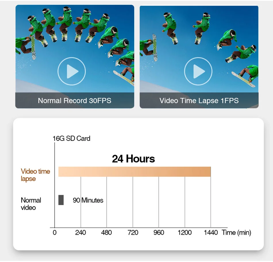 Если взять в качестве примера карту памяти объемом 16 ГБ, то в режиме 30 кадров в секунду можно записывать только один час видео. После включения функции покадровой записи время записи в режиме ниже 1 кадра в секунду будет достигать 30 часов (более 24 часов), что увеличит Максимальное время записи и хранения данных в 30 раз, обеспечивая сохранность записываемого материала, Значительно экономит место для карты памяти и защищает ваш автомобиль более 24 часов. (Примечание: необходимо купить линию buck)