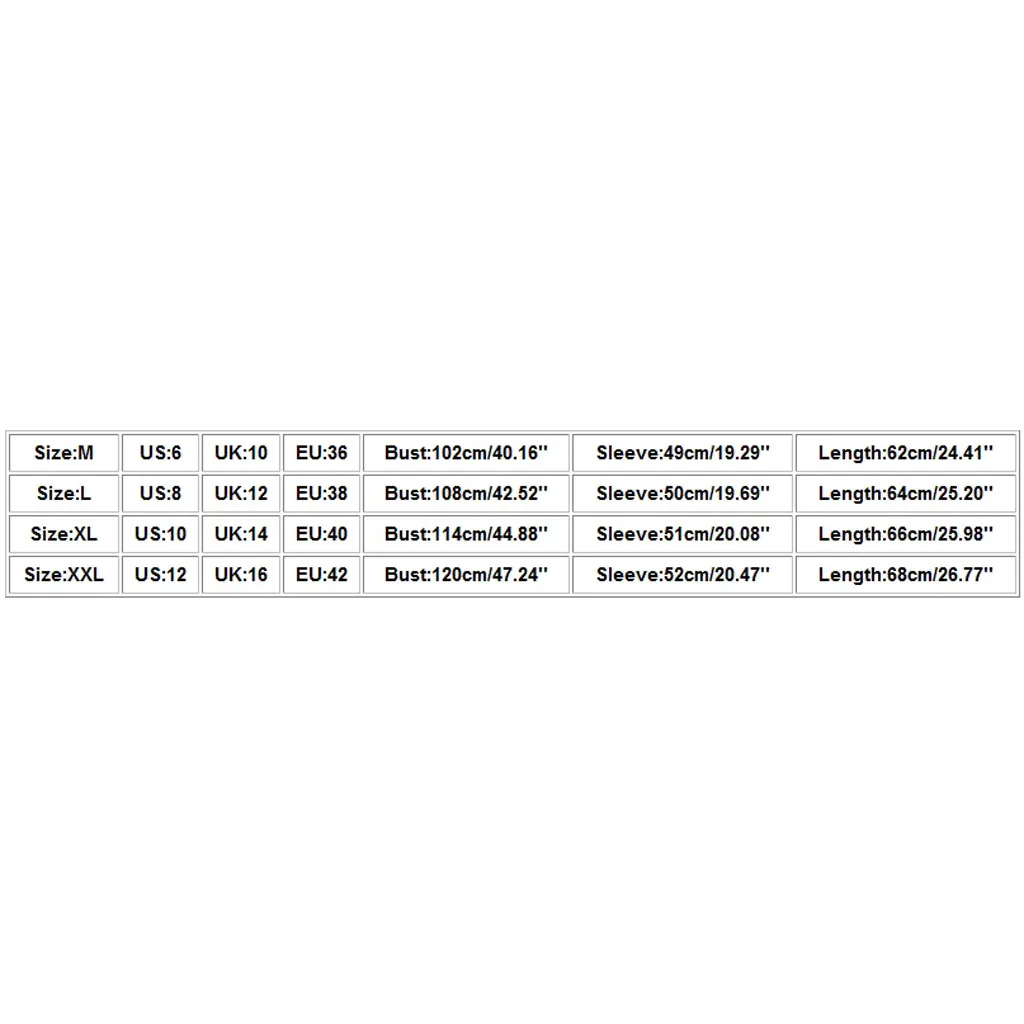 Size US UK EU Bust Sleeve Length M 6 10 36 102cm/40.16'' 49cm/19.29'' 62cm/24.41'' L 8 12 38 108cm/42.52'' 50cm/19.69'' 64cm/25.20'' XL 10 14 40 114cm/44.88'' 51cm/20.08'' 66cm/25.98'' XXL 12 16 42 120cm/47.24'' 52cm/20.47'' 68cm/26.77''