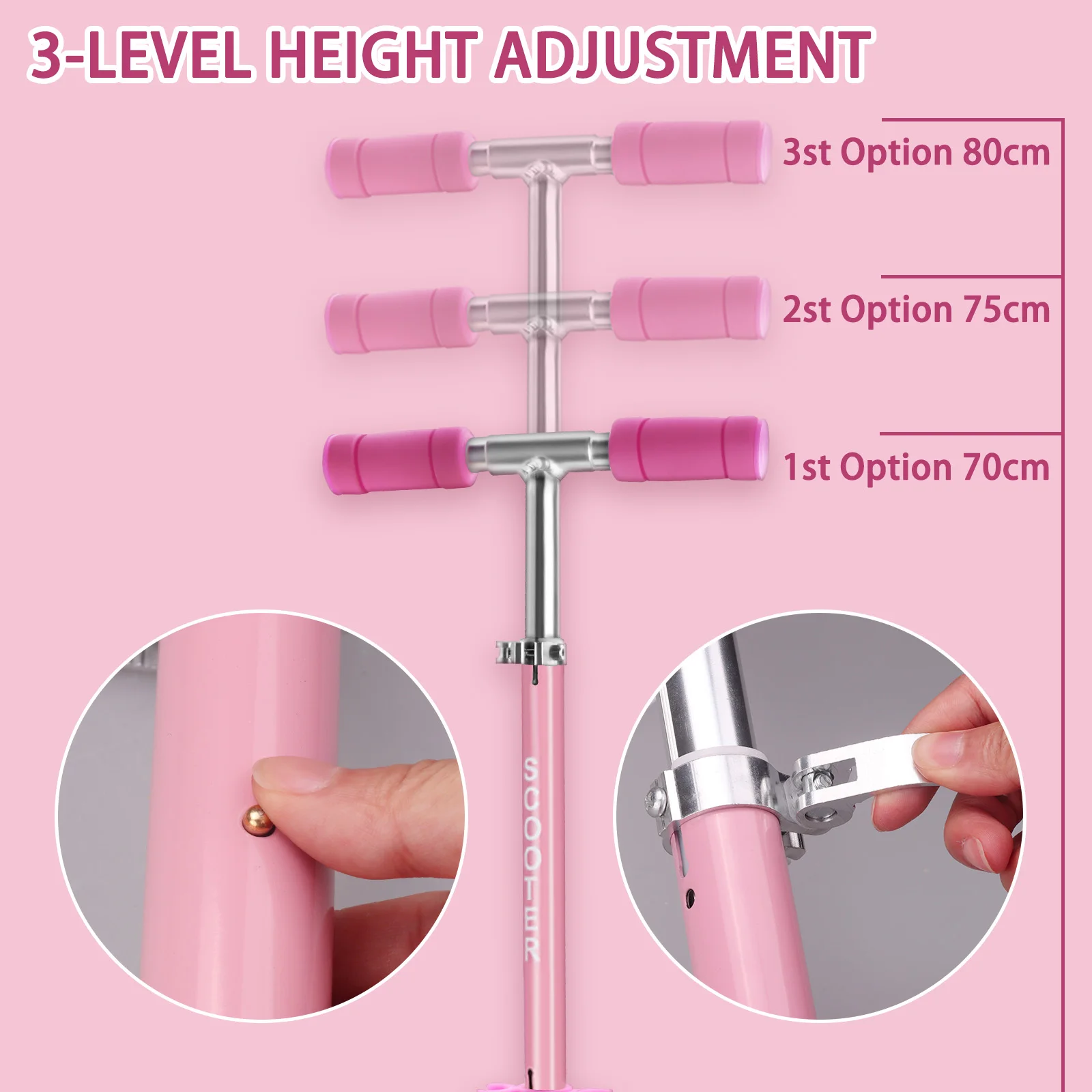 Складной, 3 уровня регулировки высоты:Скутер имеет быструю складную конструкцию с одной кнопкой, весь корпус и & nbsp; Руль можно сложить, который очень легко носить с собой или хранить, и не занимает слишком много места. Высота губчатые насадки на руль можно регулировать в соответствии с ростом ребенка, его можно отрегулировать от начального 60 см до 72 см, 77 см, 82 см, фиксированный замок поможет зафиксировать выбранную высоту.