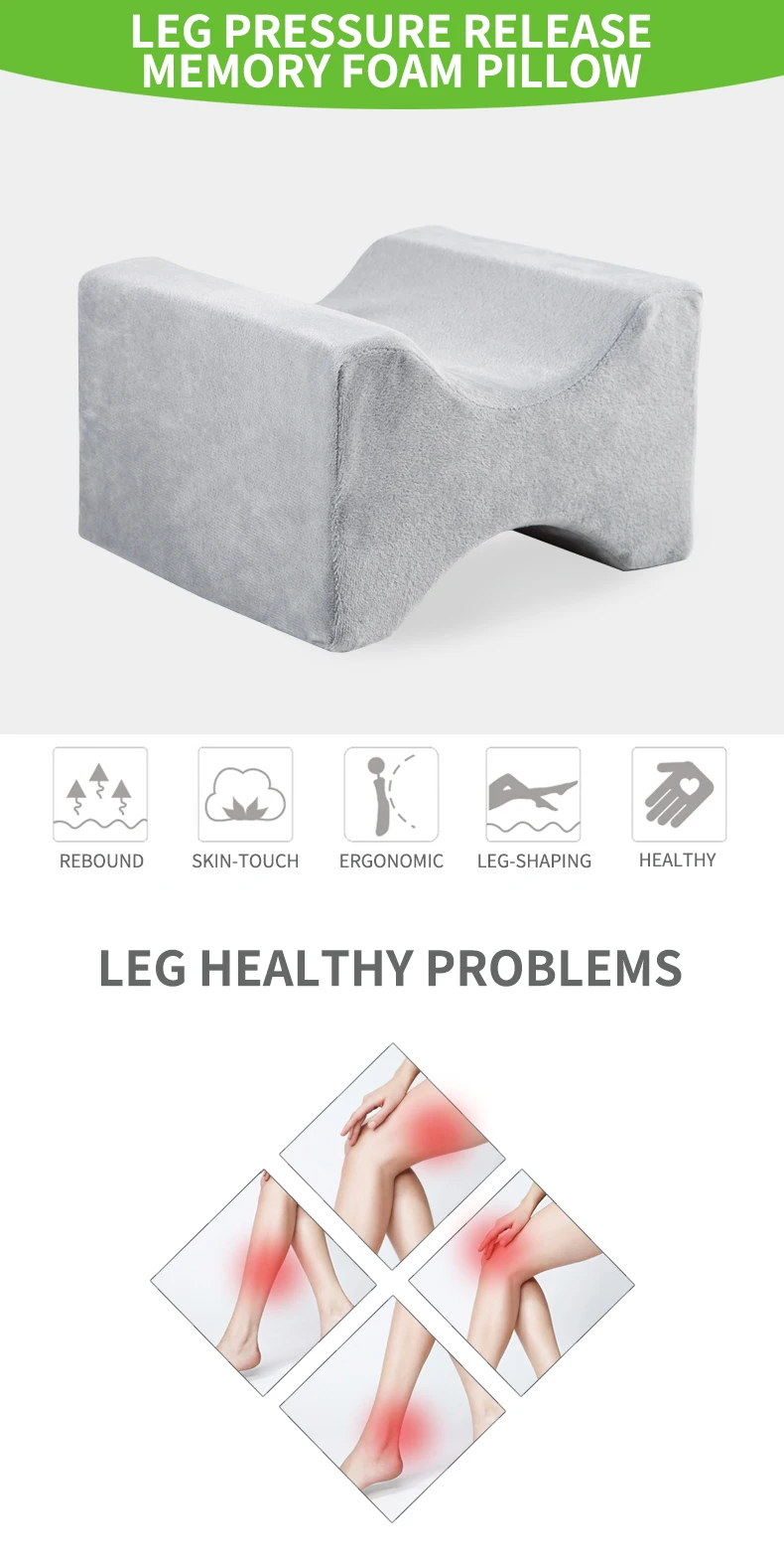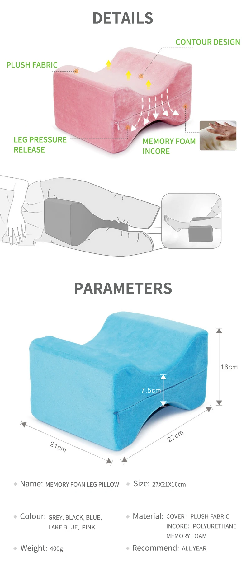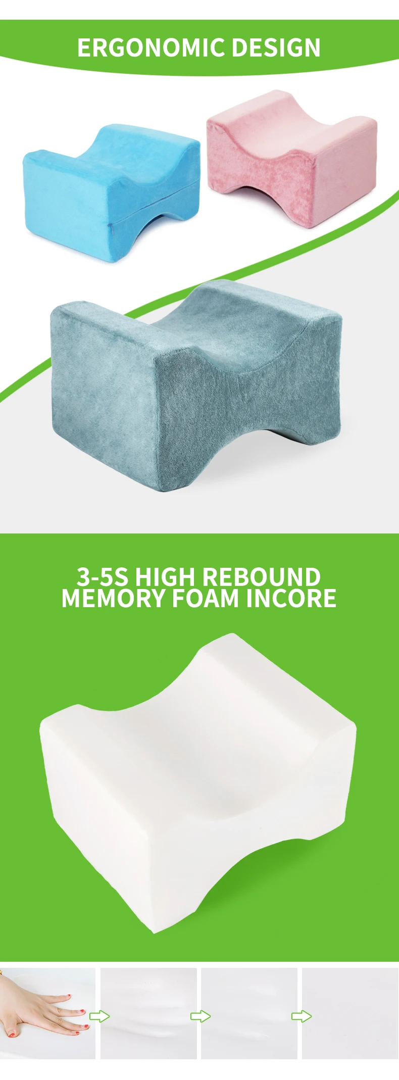 Цвет: розовый; Зеленый; Черный, Голубой; Серый Размер подушки: 27*21*15 см Материал: Приятная для кожи мягкая ткань, подходит для беременных женщин и длительного персонала, уникальный дизайн поддержки ног, более удобный для путешествий; Продукт содержит: 1 шт. подушка