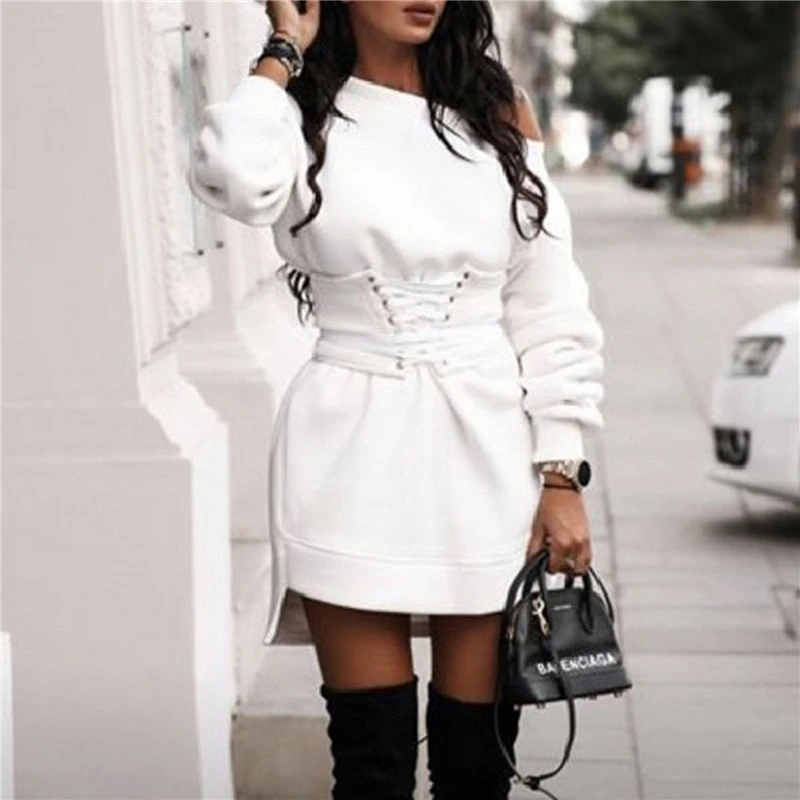 Сексуальное женское мини-платье, Осень-зима, модное Повседневное платье с круглым вырезом и высокой талией, с длинным рукавом, на шнуровке, черный и белый цвета