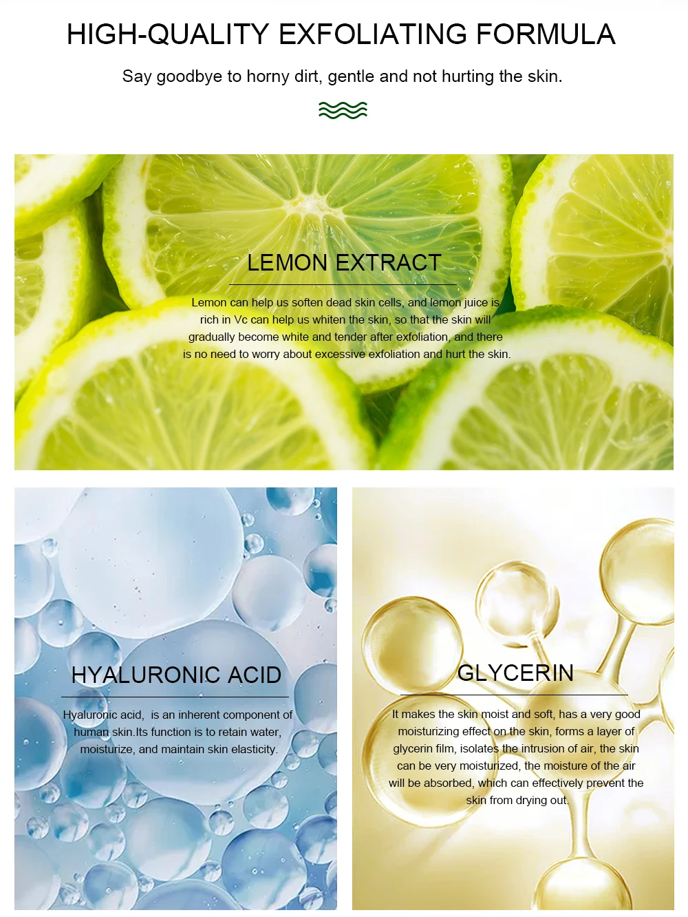 Попрощайтесь с роговой грязью, нежным и не повреждая кожу. Экстракт лимона Лимон может помочь нам смягчить омертвевшие клетки кожи, а лимонный сок богат Vc может помочь нам отбелить кожу, так что кожа постепенно станет белой и нежной после отшелушивания, И нет необходимости беспокоиться о чрезмерном отшелушивании и повреждении кожи. Гиалуроновая кислота Гиалуроновая кислота, является неотъемлемой составляющей кожи человека. Ее функция-удерживать воду, увлажнять и поддерживать эластичность кожи. Глицерин Это делает кожу влажной и мягкой, очень хорошо увлажняет кожу, образует слой глицериновой пленки, изолирует вторжение воздуха, кожа может быть очень увлажнена, влага воздуха будет поглощена, что эффективно предотвращает высыхание кожи. Prunus Persica Nectarina Уникальный ароматный экстракт персика успокаивает и снимает давление кожи, эффективно улучшает тусклую кожу и быстро восстанавливает влагу кожи, помогая обезвоженной коже восстановить ее нежность и эластичность. Кожа светится здоровым и увлажненным изнутри.