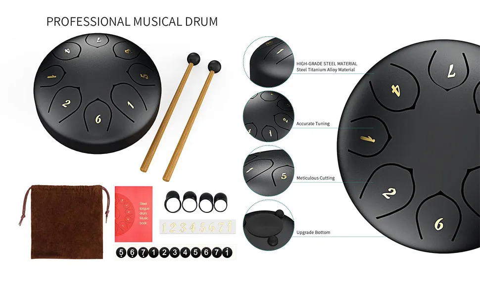 * 6 дюймов 8 Примечание стальной барабан: Изготовлен из стального титанового сплава, может дать четкий, Эфирный, как Будда звук, и с более широким естественным диапазоном 8 тонов, которые могут быть воспроизведены с наиболее распространенными мелодиями. Не так сложно и легко начать. * Красивый и прочный: поверхность защитной краски не только выглядит красиво, но и предотвращает появление ржавчины, истирания и царапин. 3 резиновые ножки могут предотвратить скольжение и сделать звук барабана ярче, четче и приятнее. * Двойной Режим воспроизведения: Упаковочный лист оснащен парой молотков и пальчиковой втулки, вы можете использовать свой творческий потенциал, чтобы поразить свой собственный любимый и счастливый звук. Или следуйте инструкциям музыкальной книги, выберите песни, которые вы можете и потренируйтесь больше, вам это понравится. * Физические и умственные упражнения: упражнения руками, мозгом и сердцем! Игра на барабанах может изменить состав крови человека, тело и ум чувствуют себя расслабленными и счастливыми, что повышает иммунную функцию организма. * Широко используется: религиозный буддистский, конфуцианский дохо, Зен Чай Здоровье, йога медитация, тело и ум исцеление. Музыкальное образование, Звуковая терапия, не только может выразить эмоции, культивировать чувства, но и исцелить тело и ум, повысить духовность и открыть для себя красоту. Звук барабана со стальным языком красивый, приятный, пустой и глубокий, который наиболее подходит для назидания ума и очищения души. Стальной барабан для языка-это современный музыкальный инструмент в новом era. Легко научиться без сложных теорий. Наиболее подходящий инструмент для входа для любителей инструментов. Спецификация * Размер: 6 дюймов (мини-барабан для языка, для детей также) * Толщина: 3,8 дюйма * Вес нетто: 0,55 кг Посылка: * 1 * ударный барабан * 2 * барабанные молотки * 1 * держатель молотка * 1 * барабанная сумка * 1 * музыкальная книга * 1 * наклейка