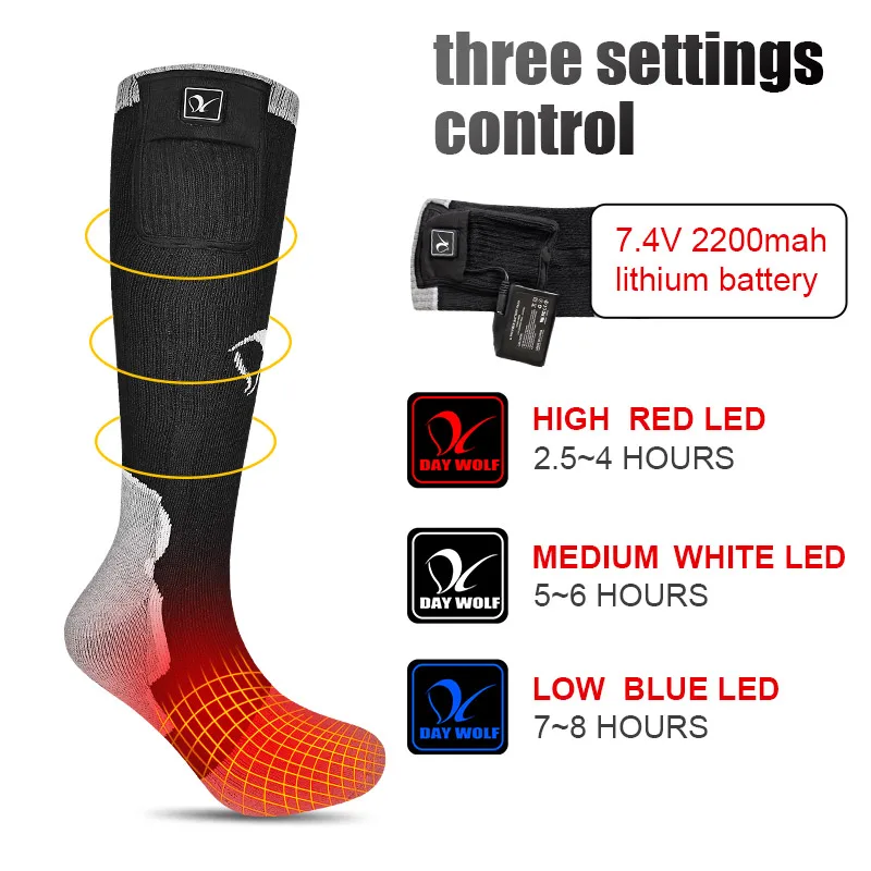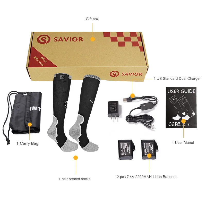 Этот зимний носок имеет длительный срок службы и оснащен литий-ионным аккумулятором 7,4 v UL / CE, сертифицированным на 2200 мАч. Он оснащен высококачественными материалами и двойной системой зарядки кабеля, которая может заряжать аккумулятор одновременно и облегчать удаление аккумулятора.